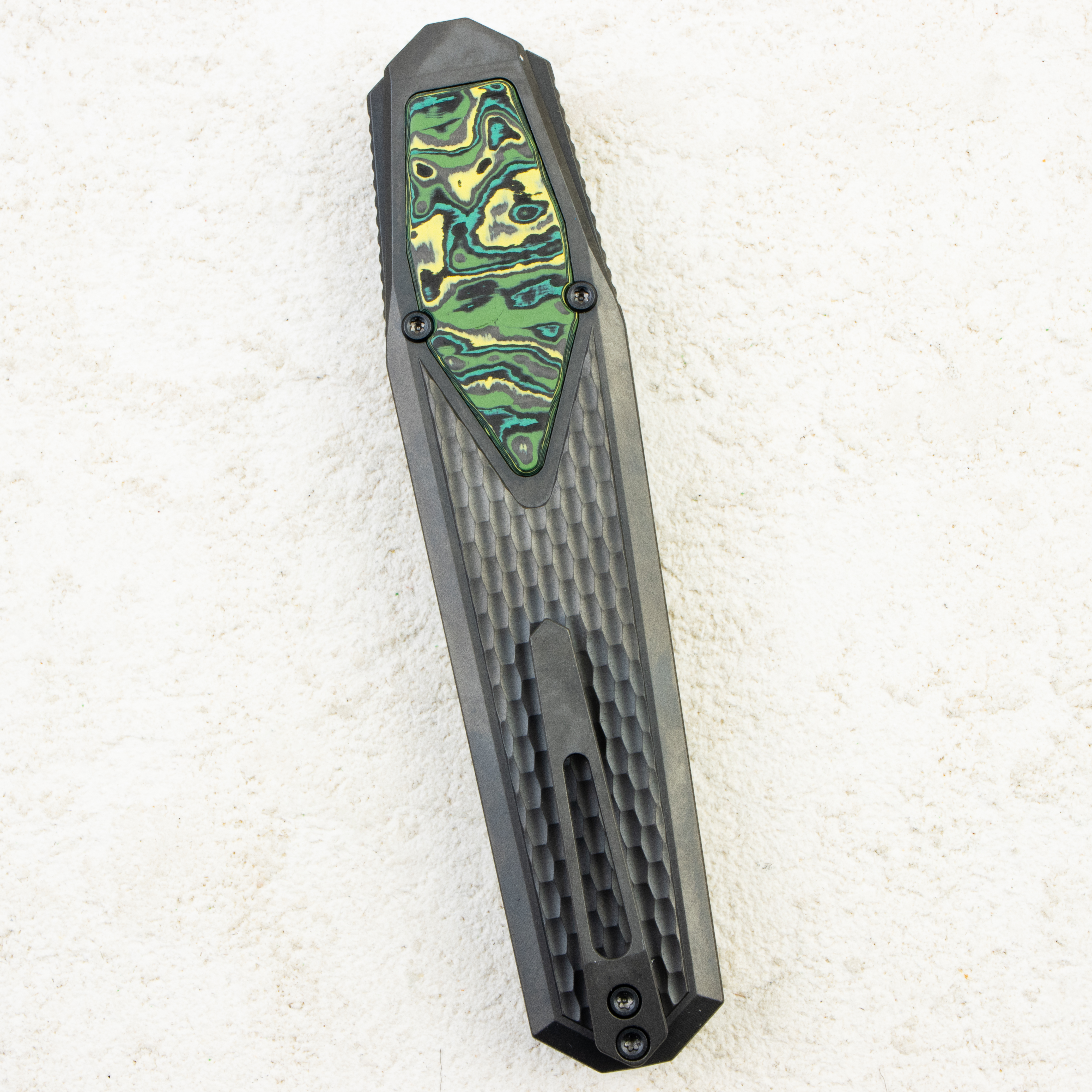 ZL101B2 — титан с ярким «toxic» carbon fiber-инлеем и матовым бласт-финишем клинка. Контрастная версия для тех, кто хочет больше цвета при сохранении строгих линий и той же механики.