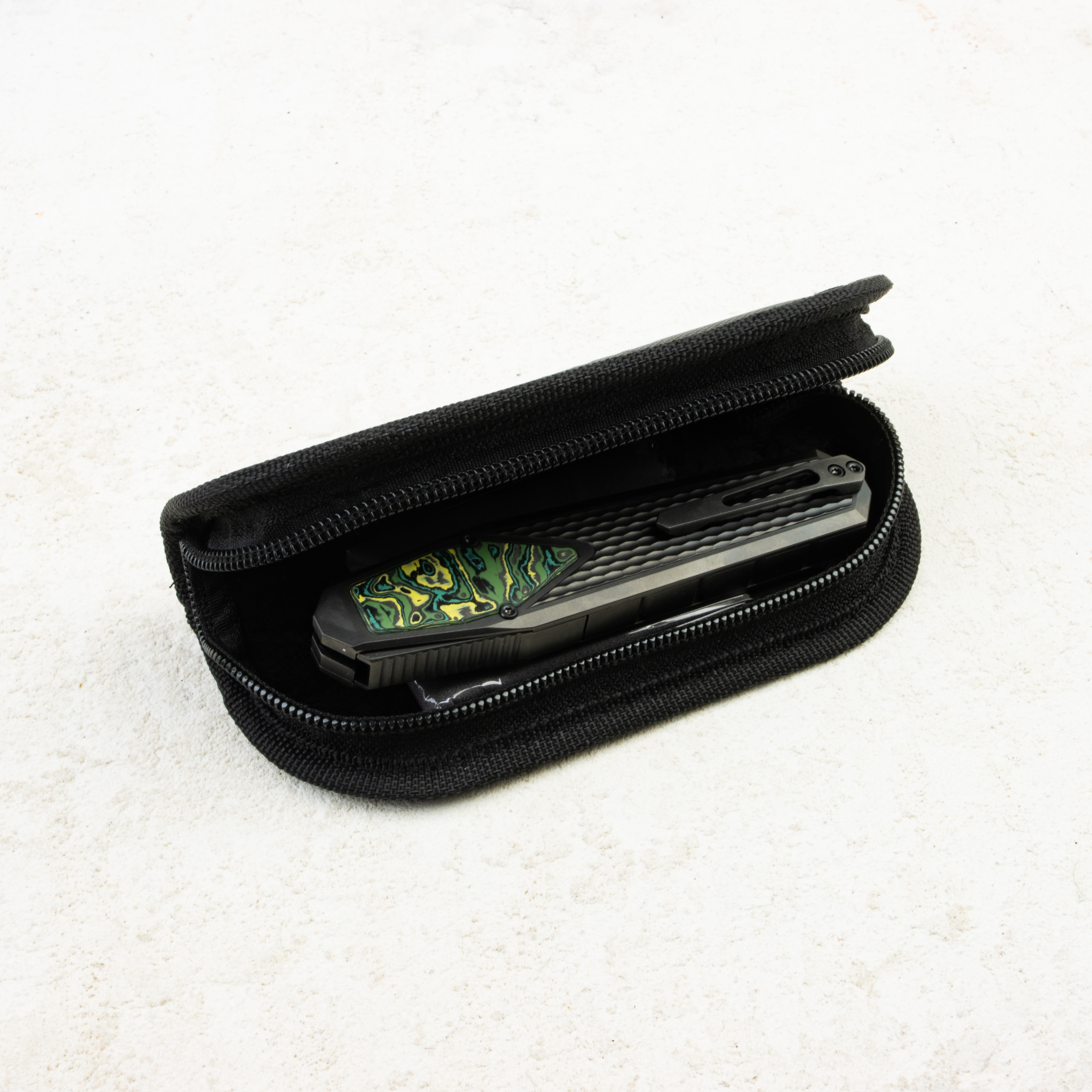 ZL101A6 — чёрный титан с инкрустацией из зелёно-чёрного карбона и чёрным клинком (DLC). Визуально самый «тактический» вариант серии: единый тёмный тон, та же чистая геометрия и гравитационная фиксация.