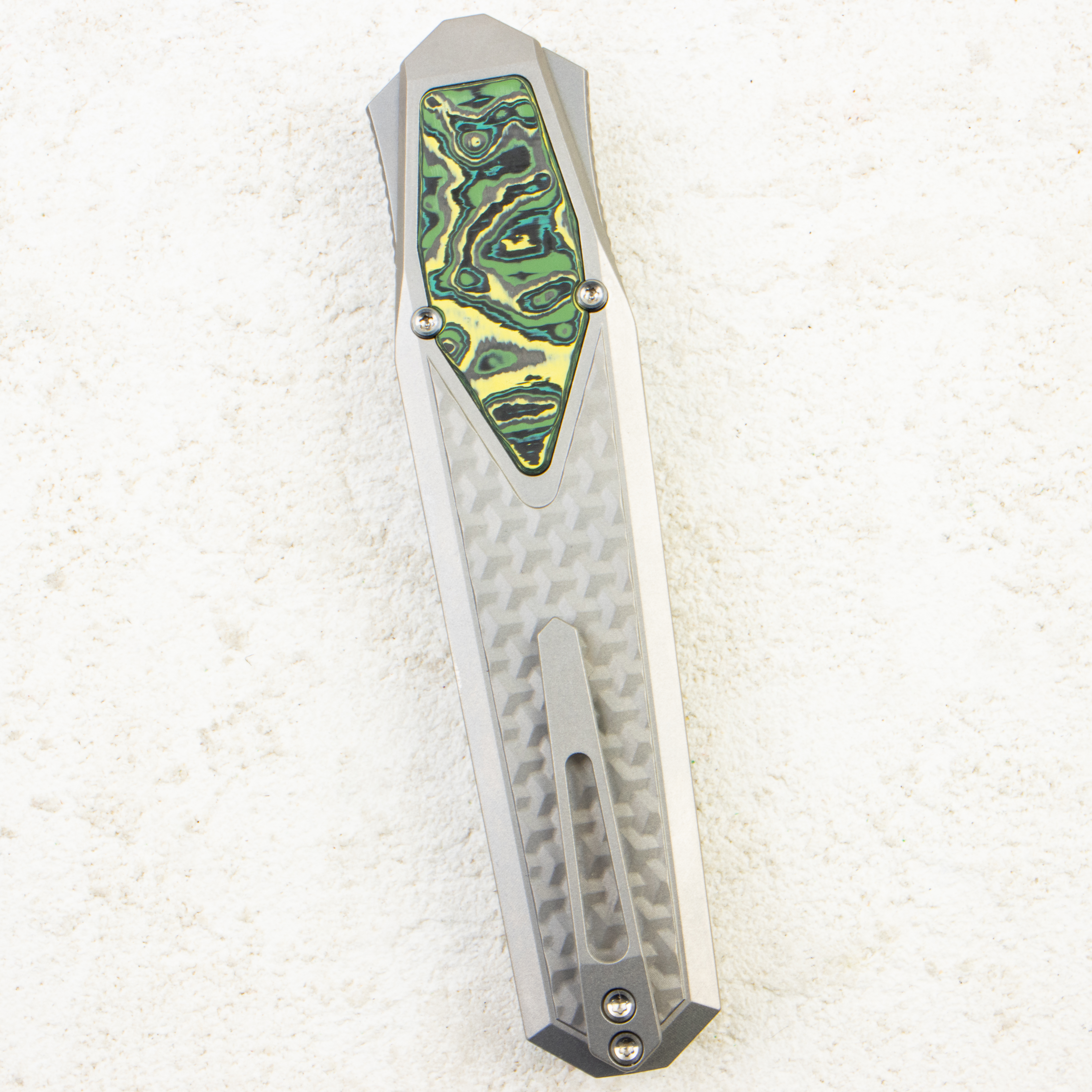 ZL101B2 — титан с ярким «toxic» carbon fiber-инлеем и матовым бласт-финишем клинка. Контрастная версия для тех, кто хочет больше цвета при сохранении строгих линий и той же механики.