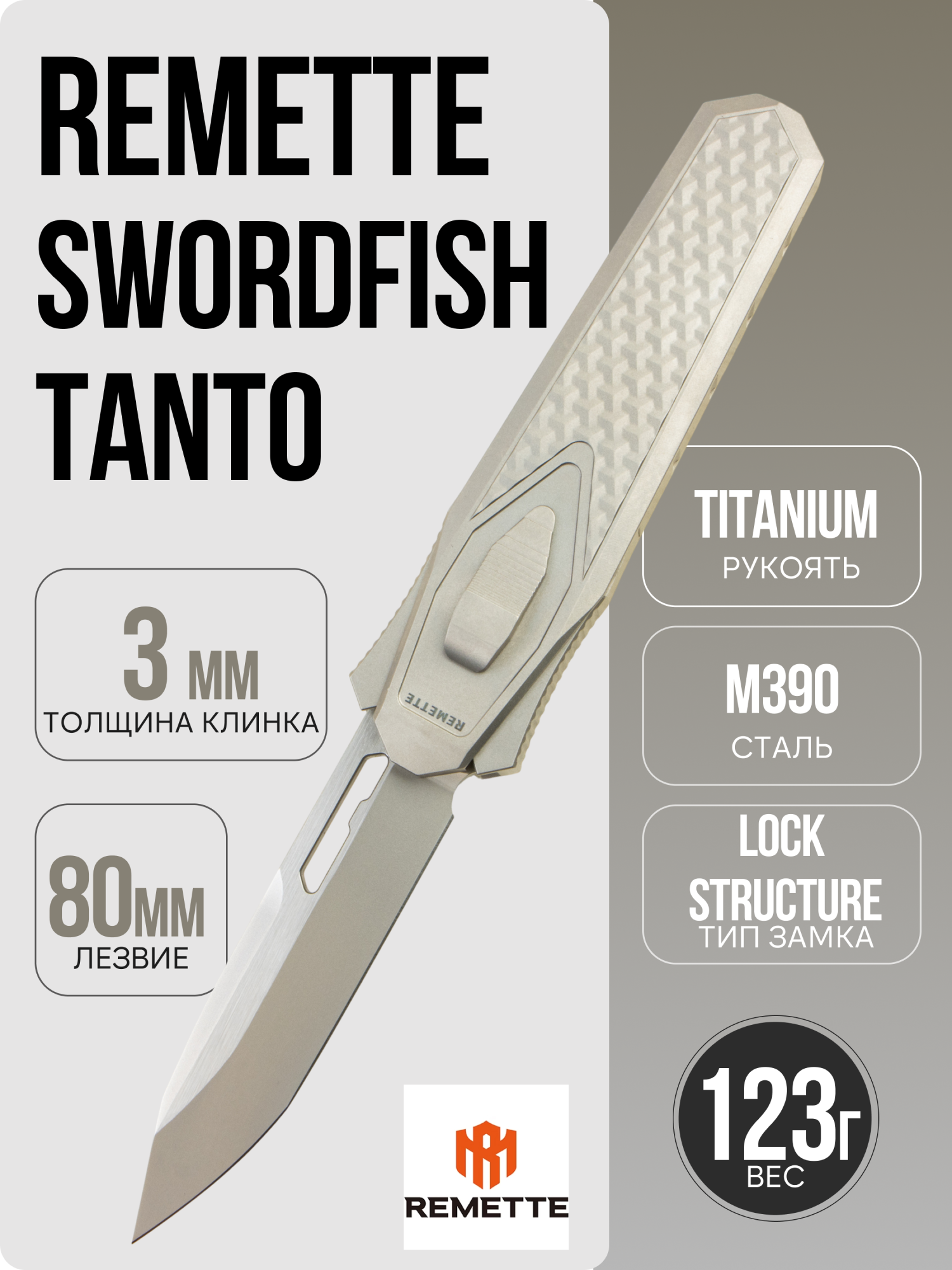 Remette Swordfish Tanto ZL101 — премиальный карманный нож с характерной «рыбьей» линией клинка и акцентом на чистую механику. Клинок из порошковой M390 в профиле reverse tanto с плоскими спусками режет ровно и предсказуемо, кончик остаётся точным и стойким на плотном материале. Ручной перламутровый сатин подчёркивает геометрию и дольше сохраняет опрятный вид в EDC.