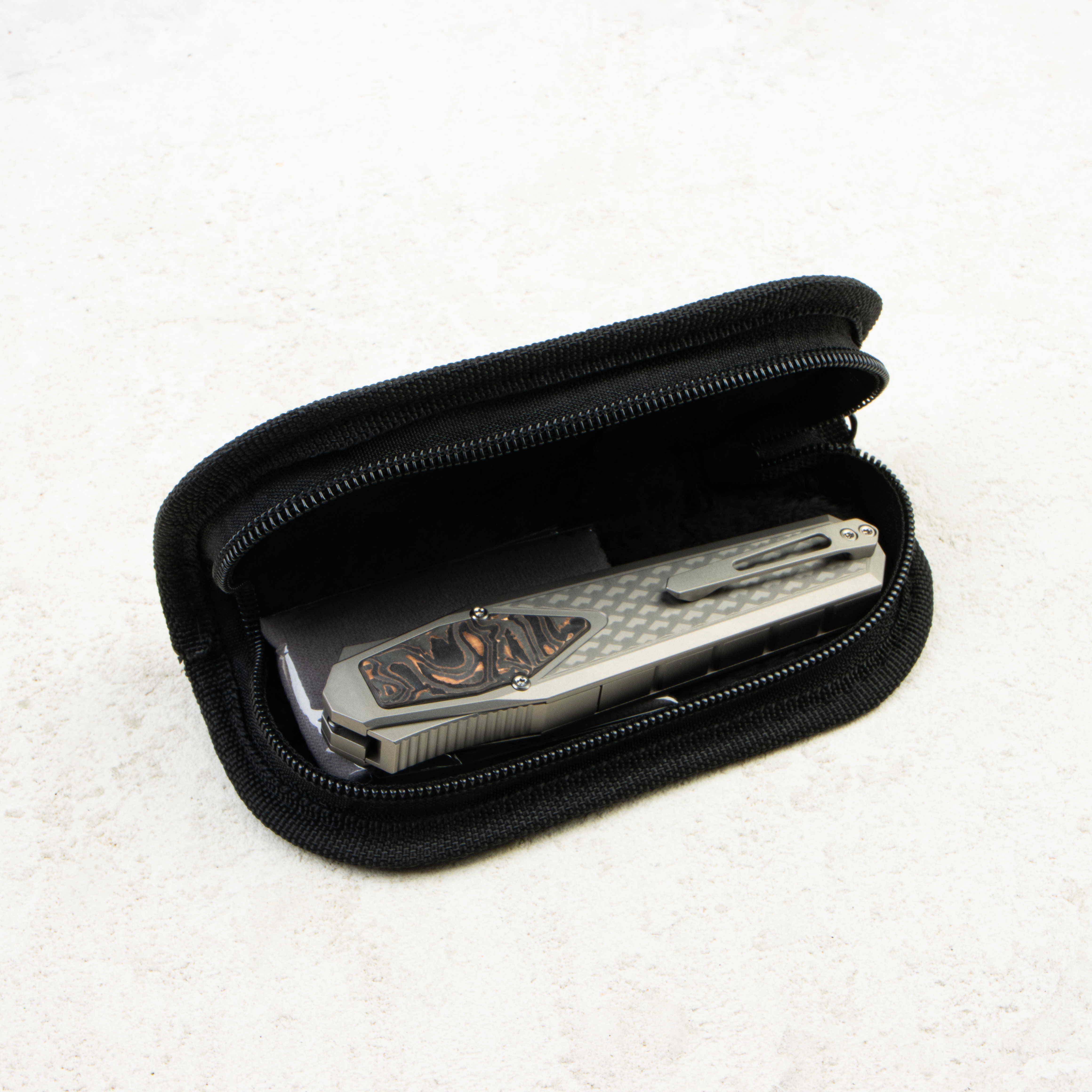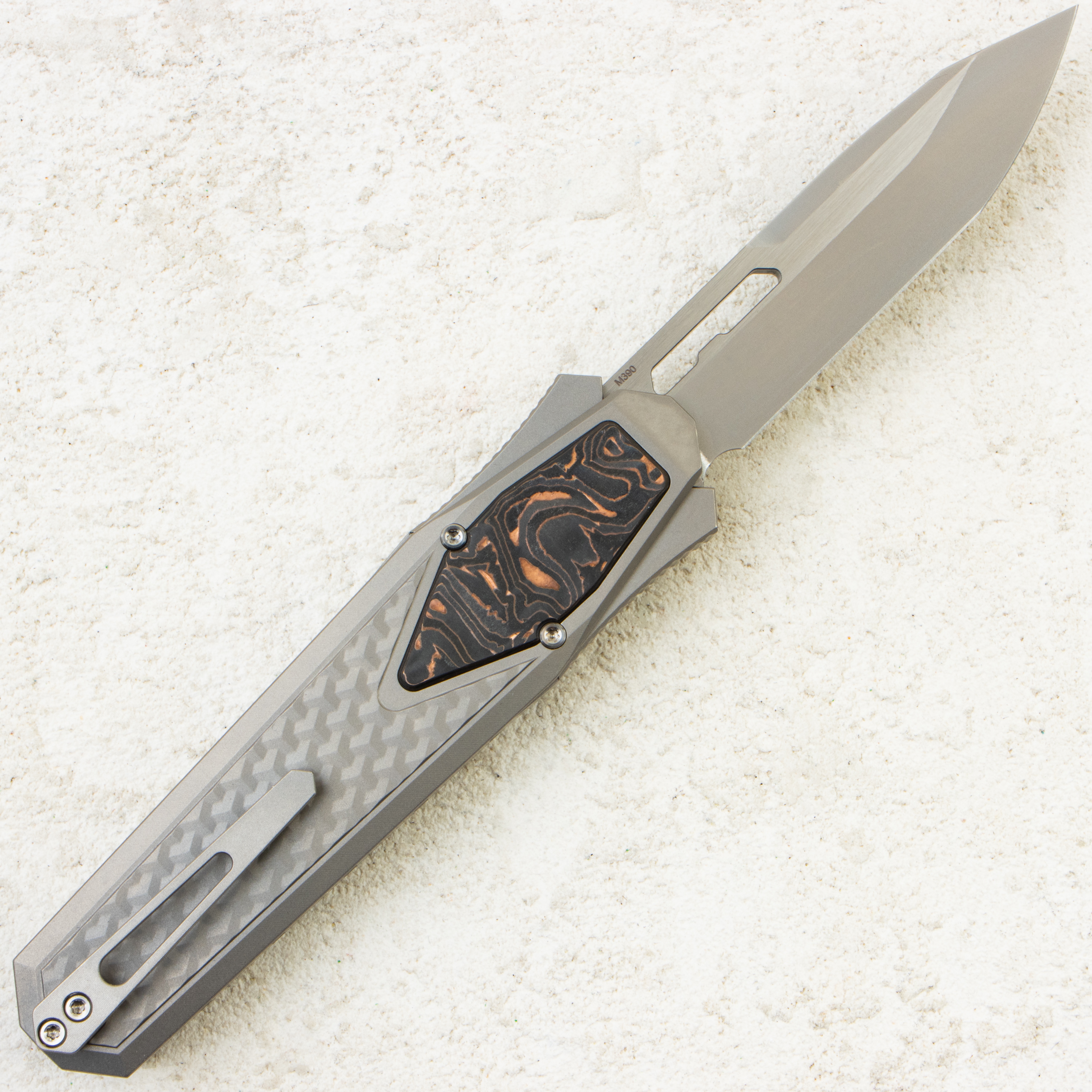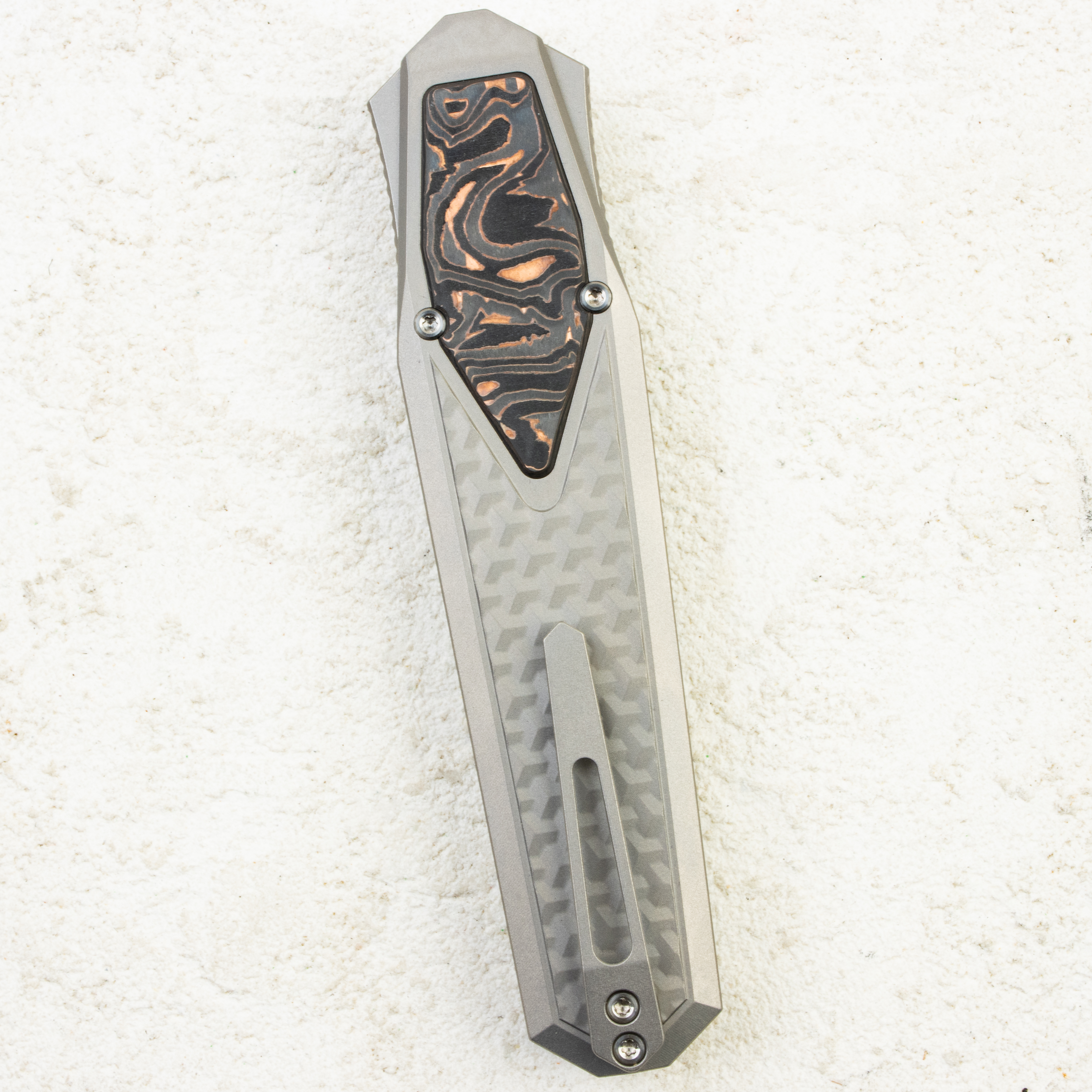 Рукоять — титан с тонкими фасками и высокоточной фрезеровкой. Вставки из карбона вровень с плоскостью не создают «горячих» точек и добавляют хвату «сухой» тактильности. Клипса tip-up обеспечивает глубокую посадку и не цепляет подкладку; баланс ближе к оси — нож ощущается «плотным» и послушным в работе.