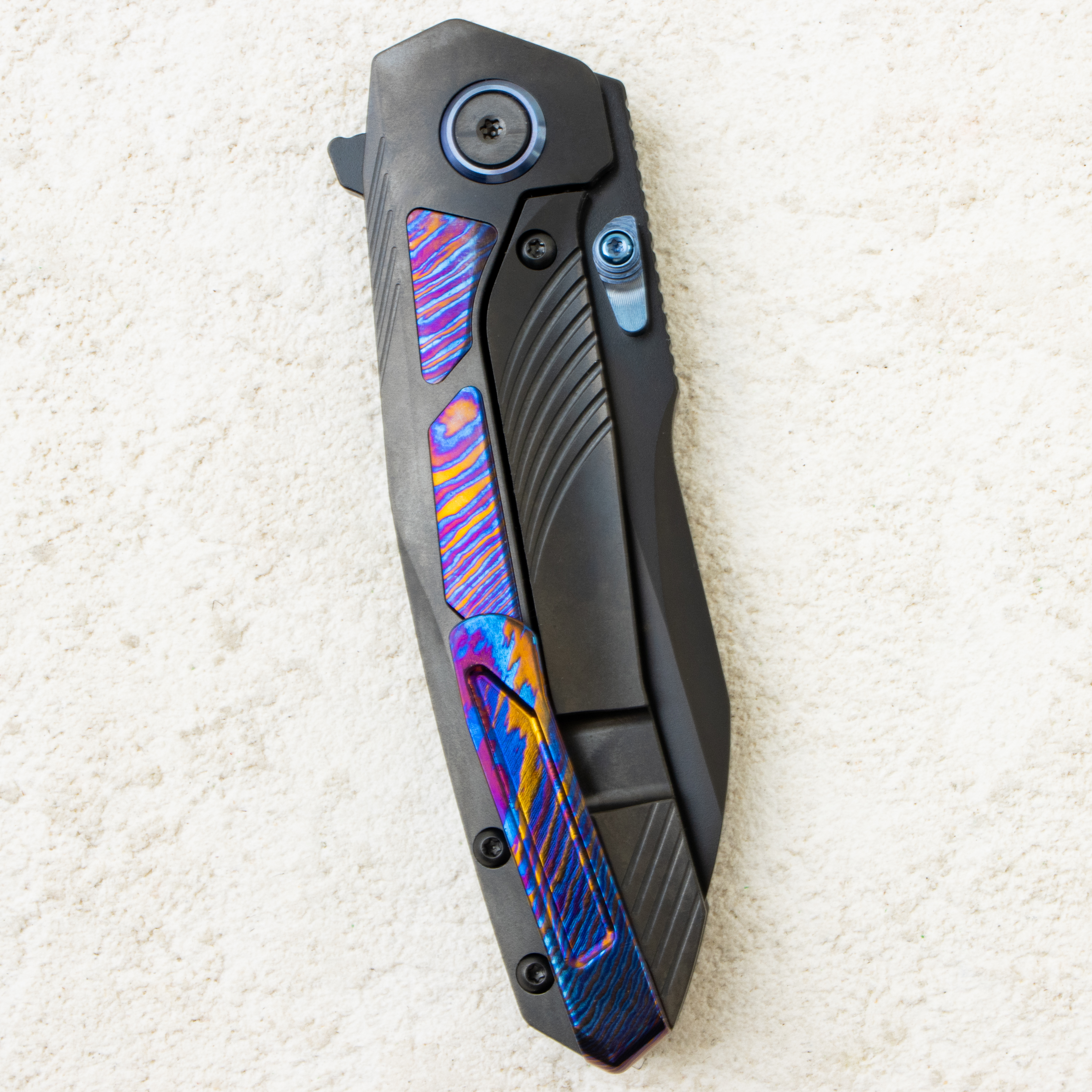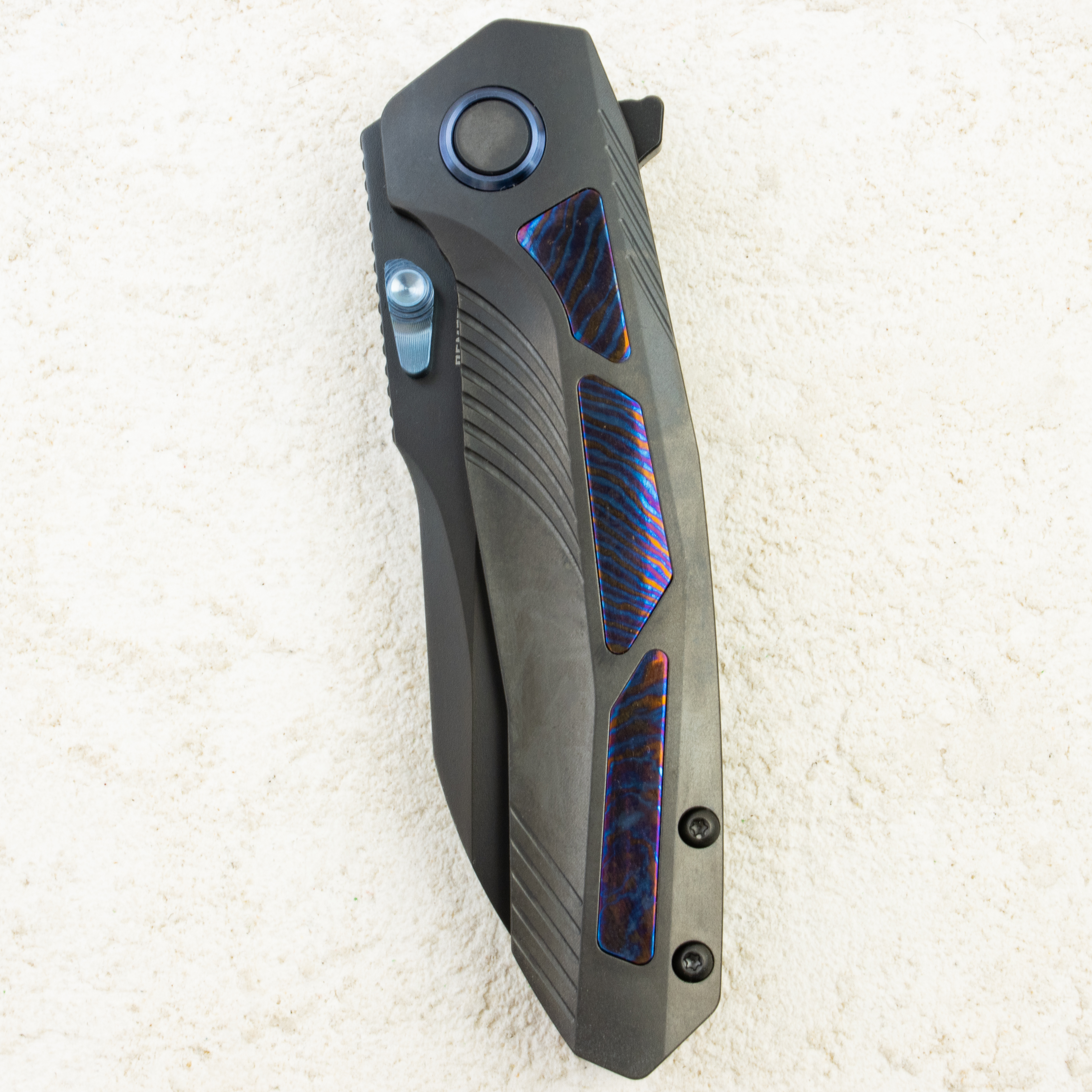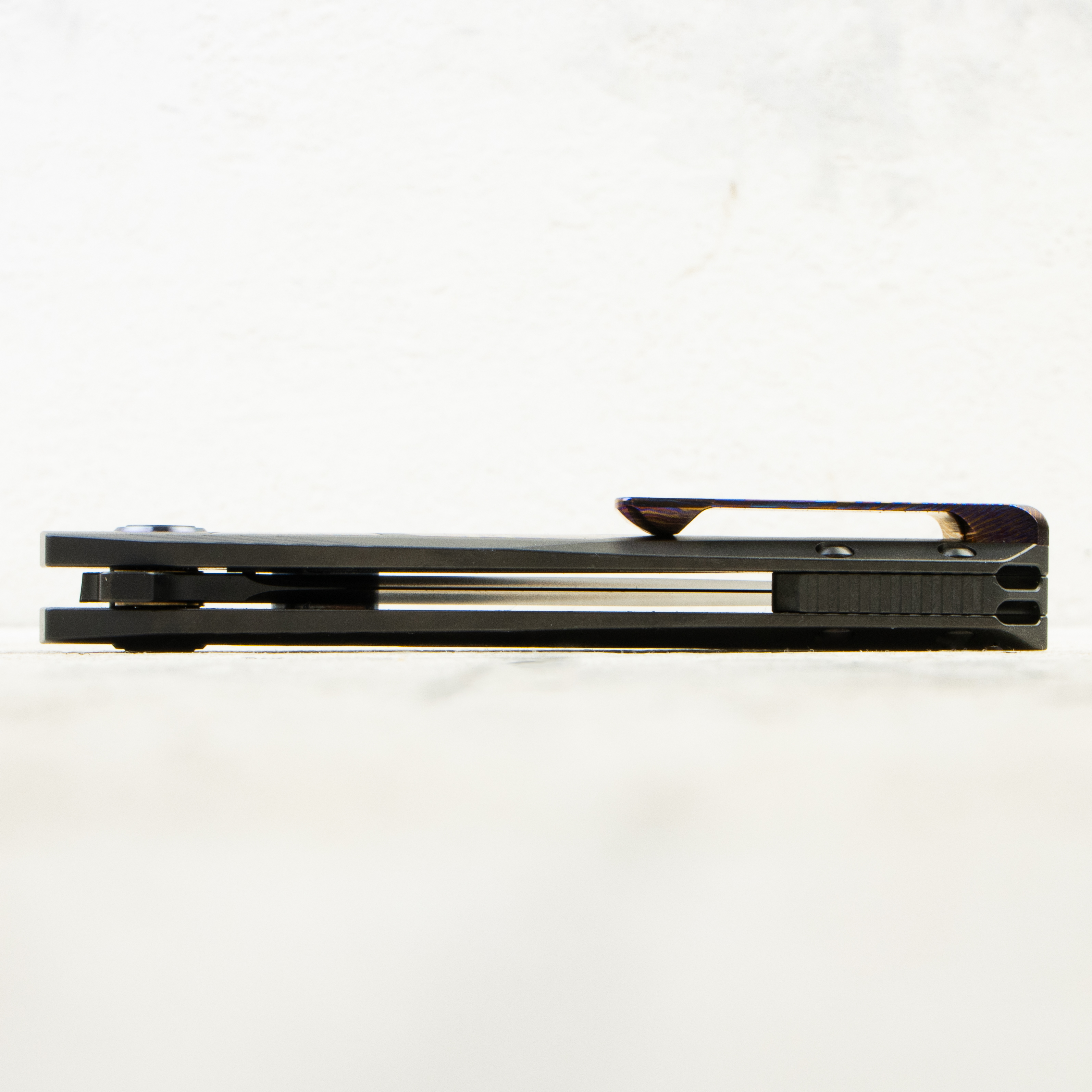 Рукоять — титан чёрного цвета с аккуратно снятыми фасками и утопленными заподлицо вставками из тимаскуса. Контуры нейтральные, без «горячих» точек; хват «сухой» и контролируемый. Толщина рукояти — 12 мм. Клипса tip-up под правую сторону обеспечивает глубокую, незаметную посадку в кармане.