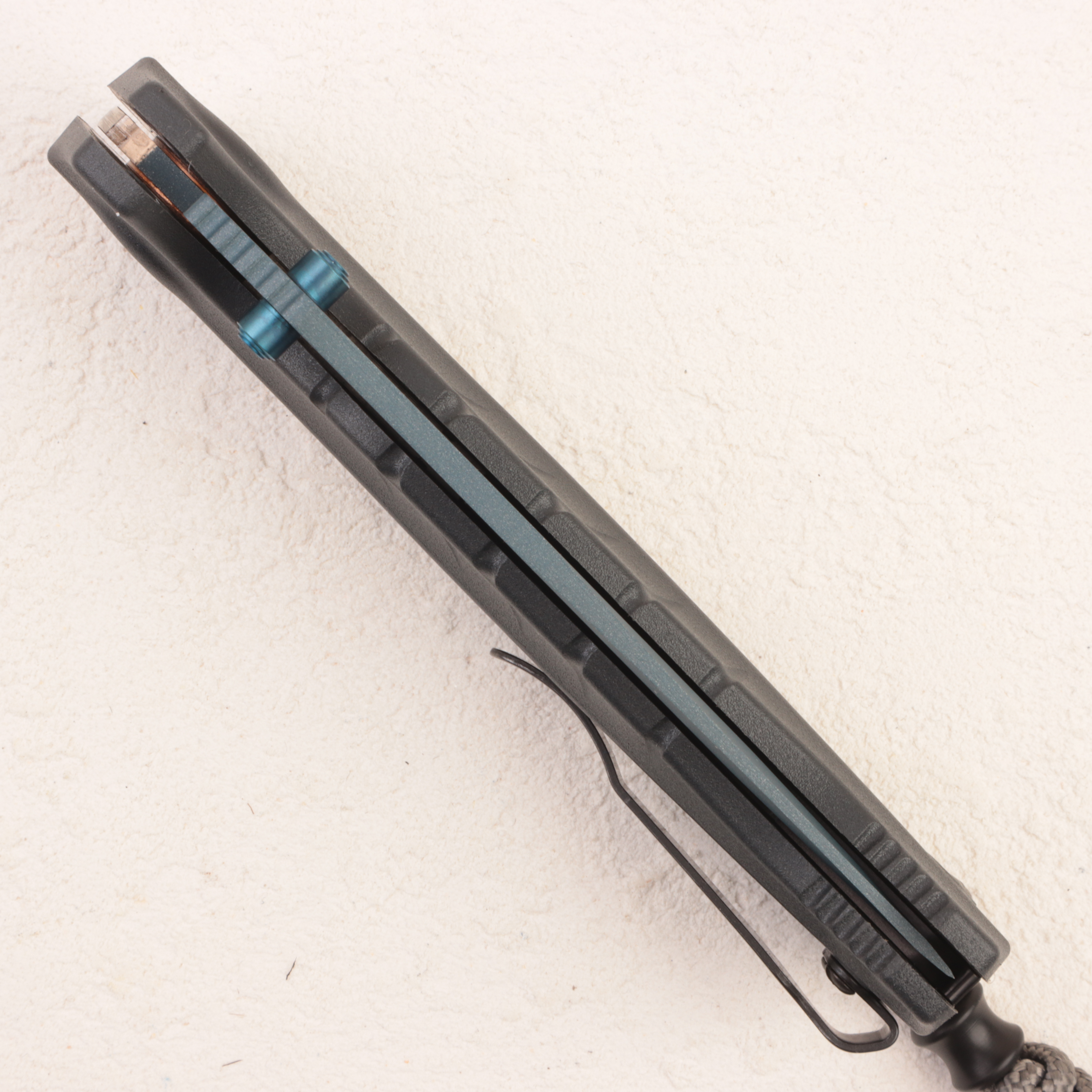 Главная особенность именно 18060BT-01 — рукоять из Grivory цвета штормовой серый. Этот материал помогает сохранить нож сравнительно легким, но при этом достаточно жестким и устойчивым к сырости для реальной полевой эксплуатации. Benchmade и продавцы отдельно отмечают, что модель рассчитана именно на мокрую среду, а сама конструкция построена на AXIS Lock, с двусторонним шпеньком и глубокой клипсой для ношения острием вверх. Внешность дополняют синие элементы фурнитуры и серый темляк, что делает нож узнаваемым, но без лишней яркости.