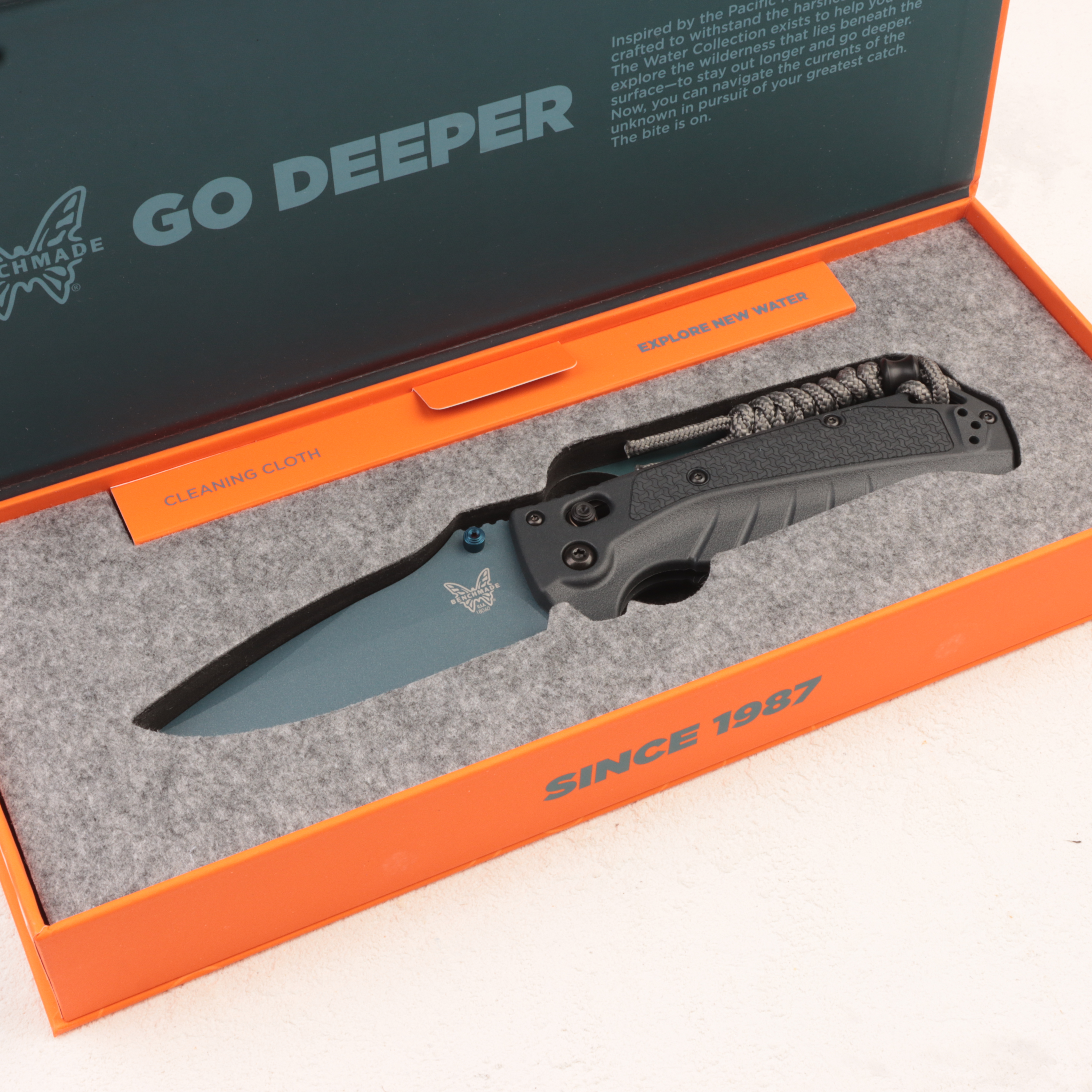 По конструкции это полноразмерный складной нож с клинком формы drop-point длиной около 9,9 см, общей длиной примерно 22,9 см и весом около 120 г. Клинок выполнен из CPM-MagnaCut с заявленной твердостью 60–62 HRC, что особенно уместно для водной модели: эта сталь хорошо сочетает стойкость к коррозии, прочность и уверенное удержание заточки. В версии 18060SBT-01 используется частично серрейторная режущая кромка, которая особенно полезна при работе с мокрой веревкой, шнуром и леской, а синее покрытие клинка Benchmade обозначает как Blue Titanium Cerakote.
