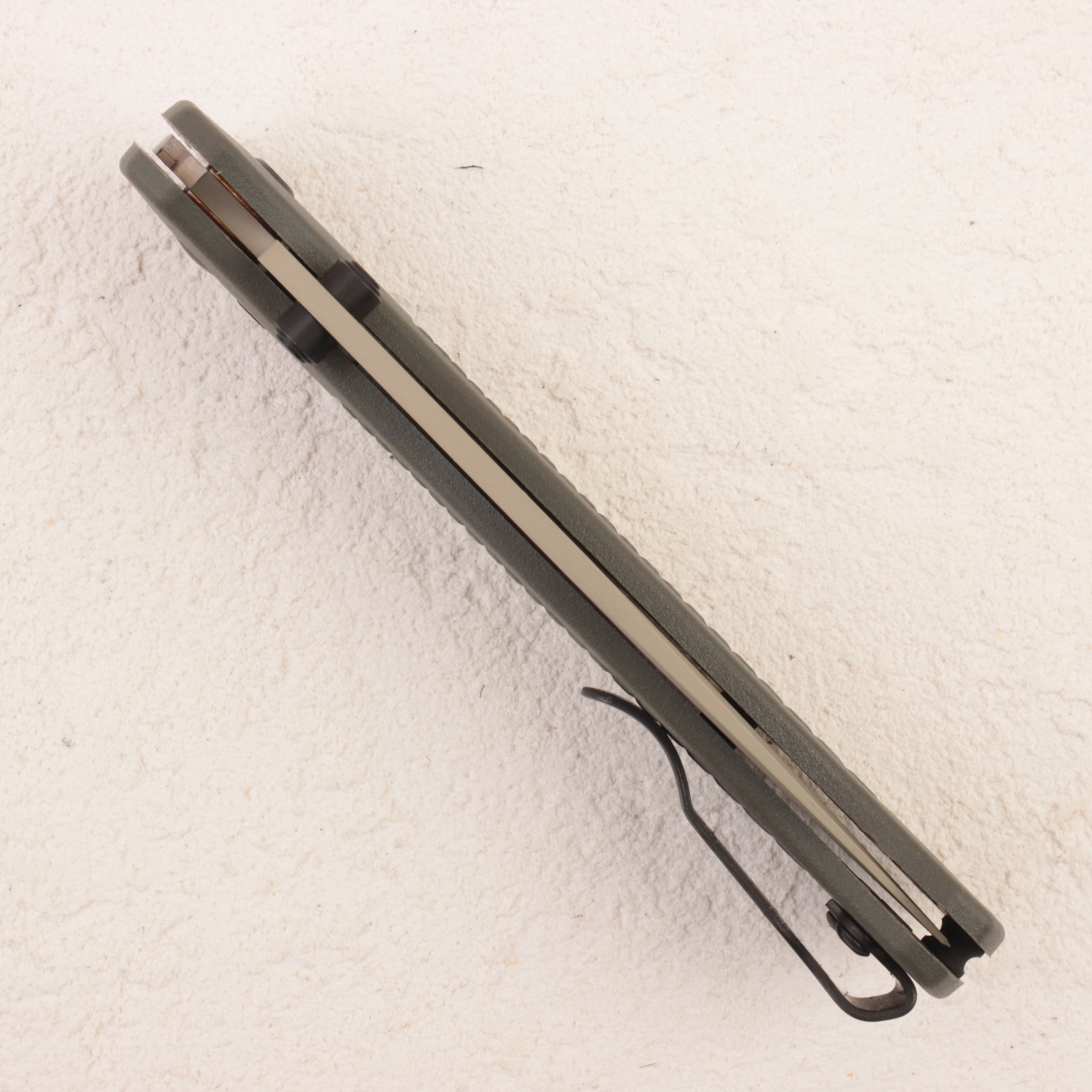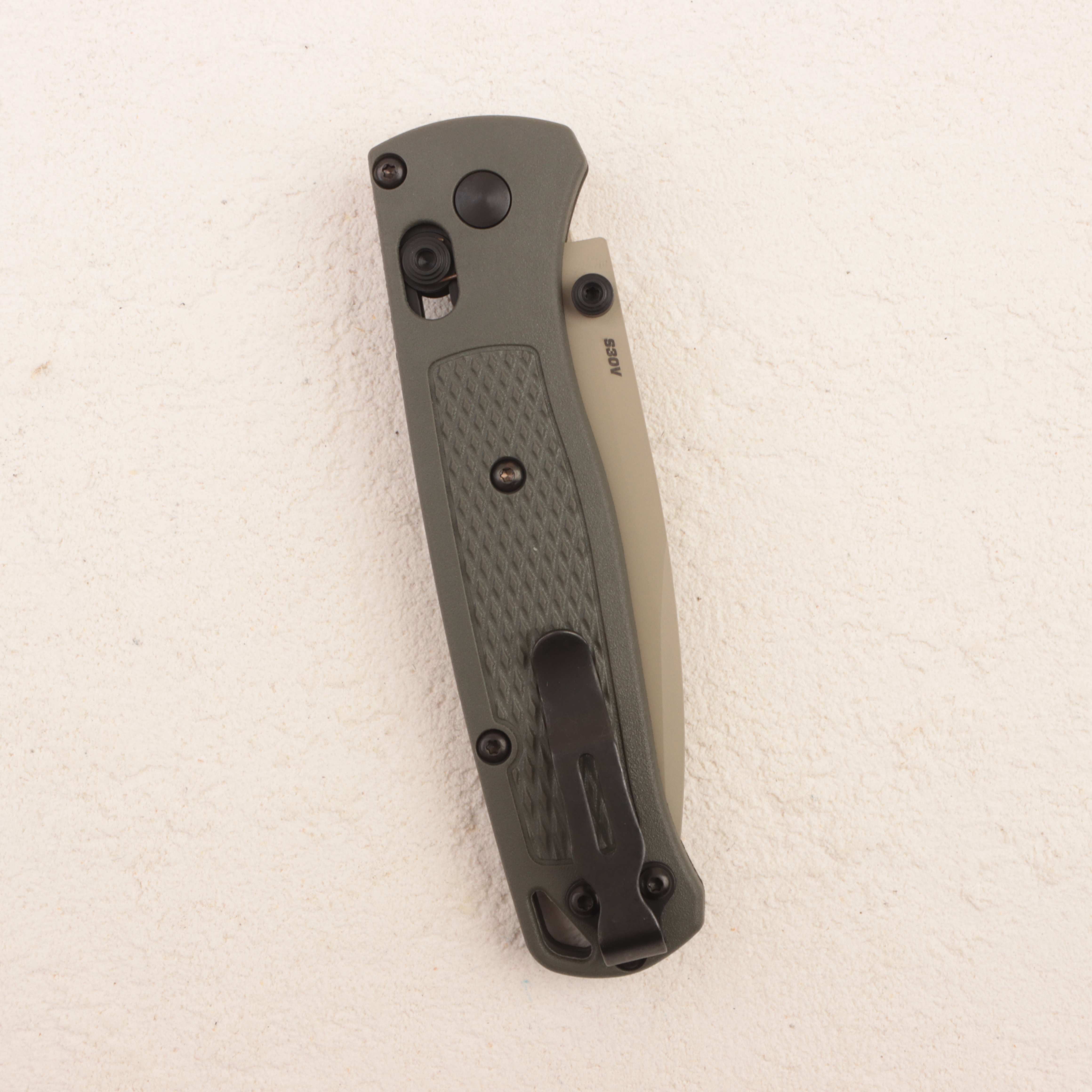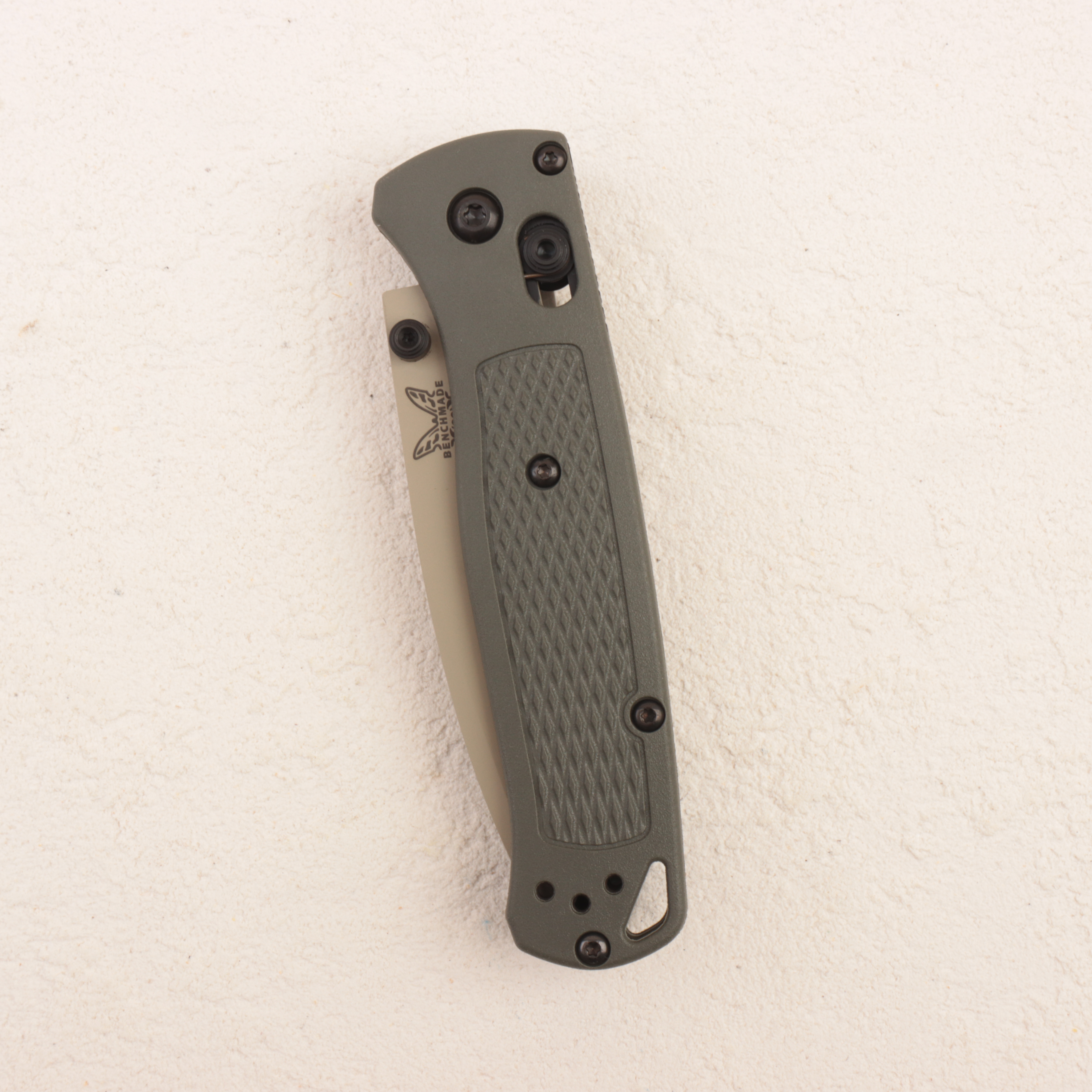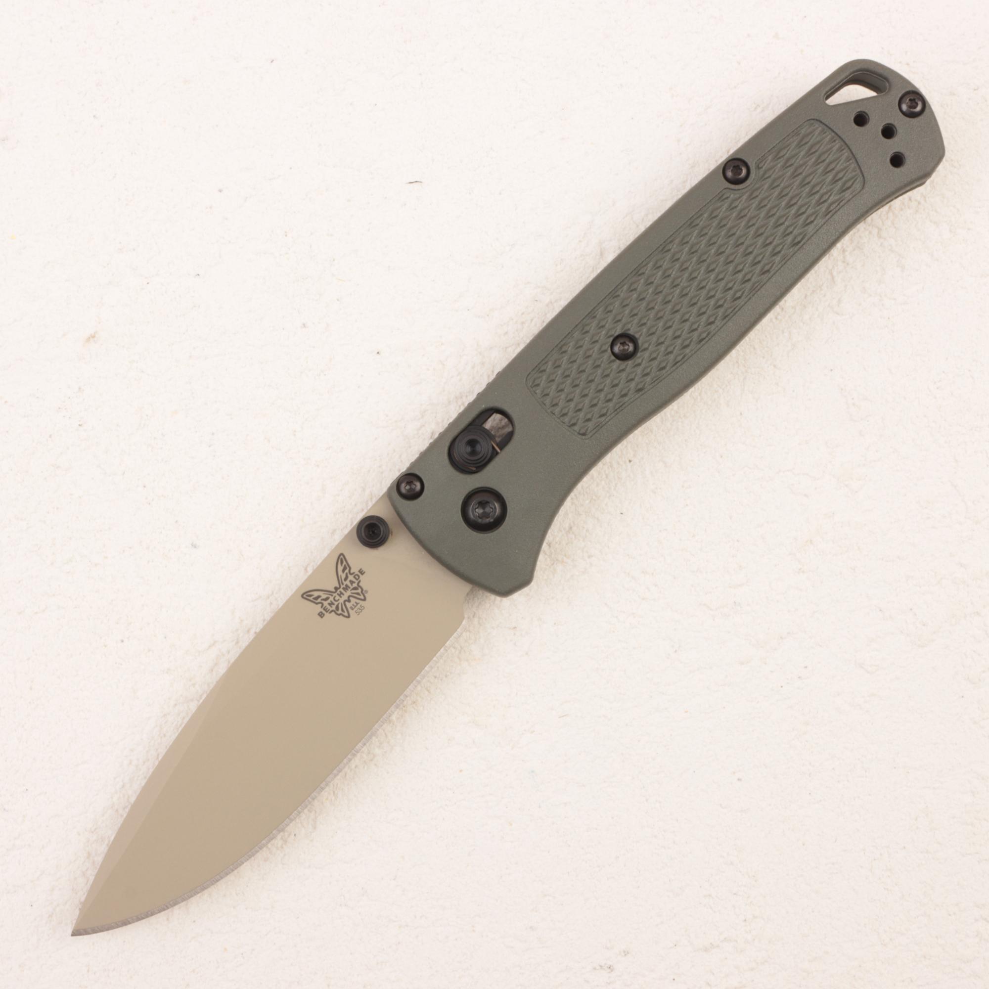 Особенность именно версии 535TN-11 — сочетание клинка с покрытием Cerakote в оттенке Desert Verde, то есть в приглушенном песочно-оливковом тоне, и рукояти из Grivory цвета темная олива. За счет этой цветовой схемы нож выглядит не просто очередным Bugout, а более собранным и «экспедиционным» вариантом. Grivory здесь выбран не случайно: этот материал помогает сохранить минимальный вес, при этом рукоять остается достаточно жесткой и удобной для реального использования.