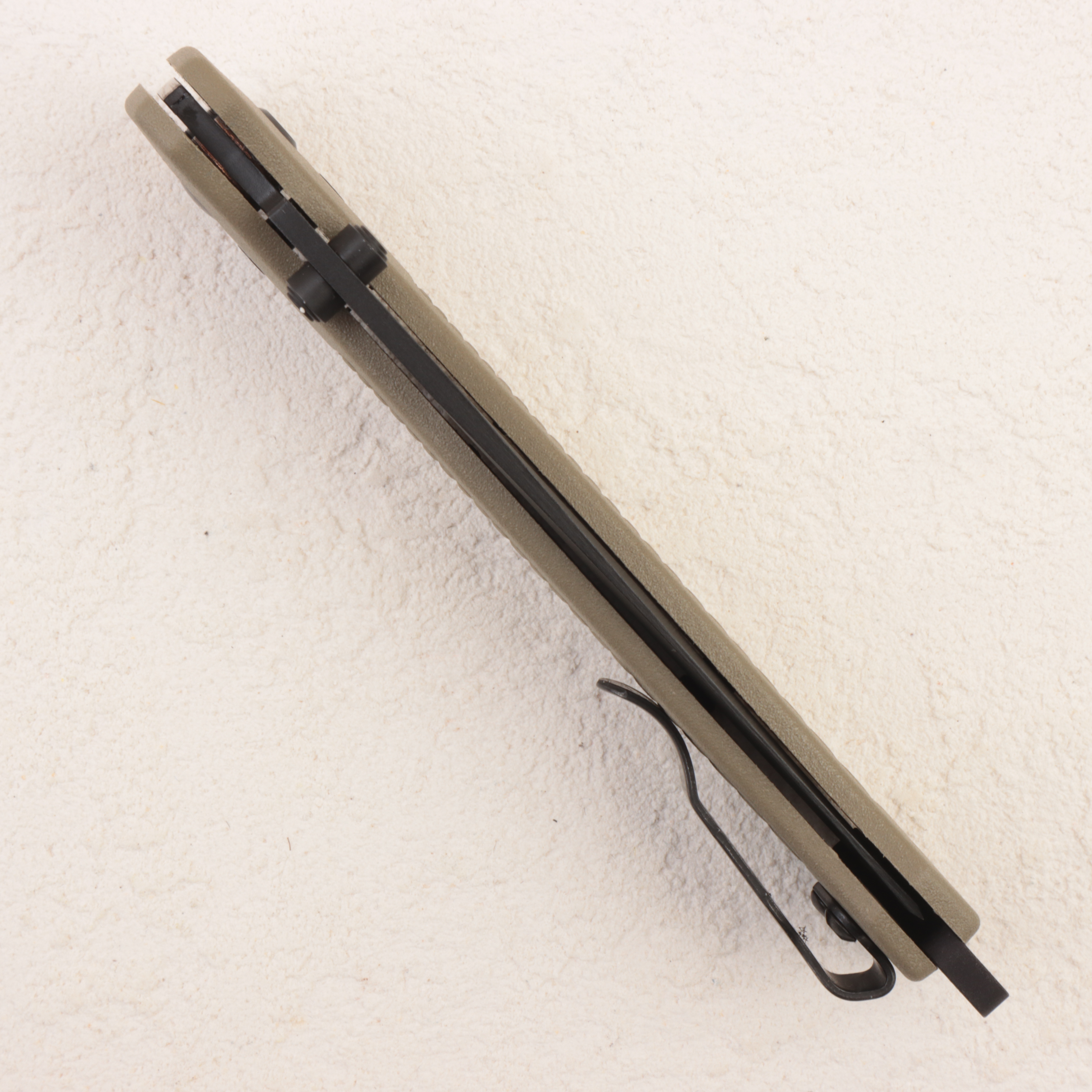 Главная особенность именно этого исполнения — рукоять из Grivory цвета ranger green, то есть в приглушенном оливково-зеленом оттенке. Этот материал позволяет сохранить очень малый вес, но при этом дает рукояти достаточную жесткость и практичность для реального использования. В описаниях продавцов отдельно отмечается текстурированная поверхность рукояти, а также темлячное отверстие и фирменная клипса глубокой посадки, переставляемая под правую и левую руку. За открывание отвечает двусторонний шпенек, а запирание построено на фирменном AXIS Lock, так что нож одинаково удобен для правшей и левшей.