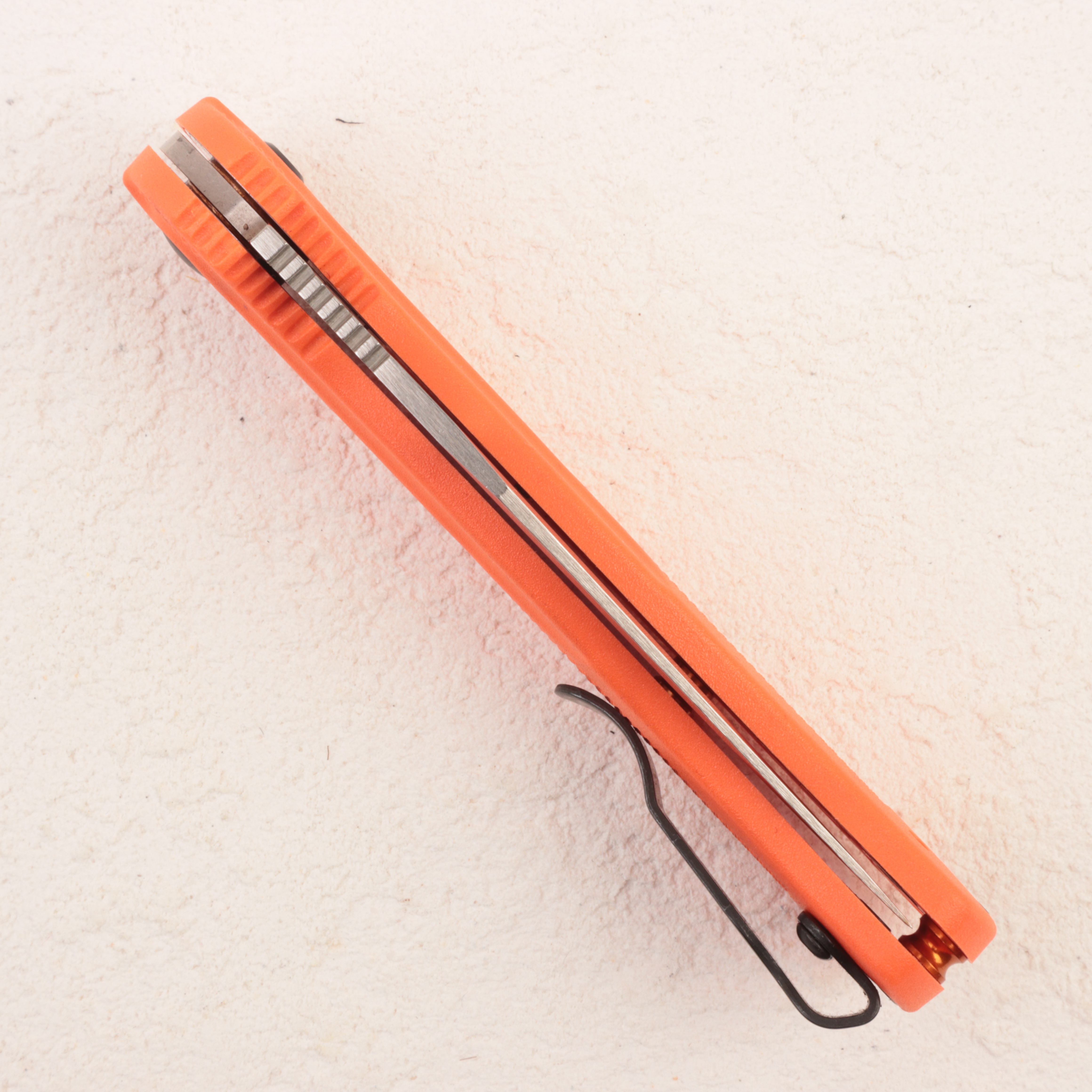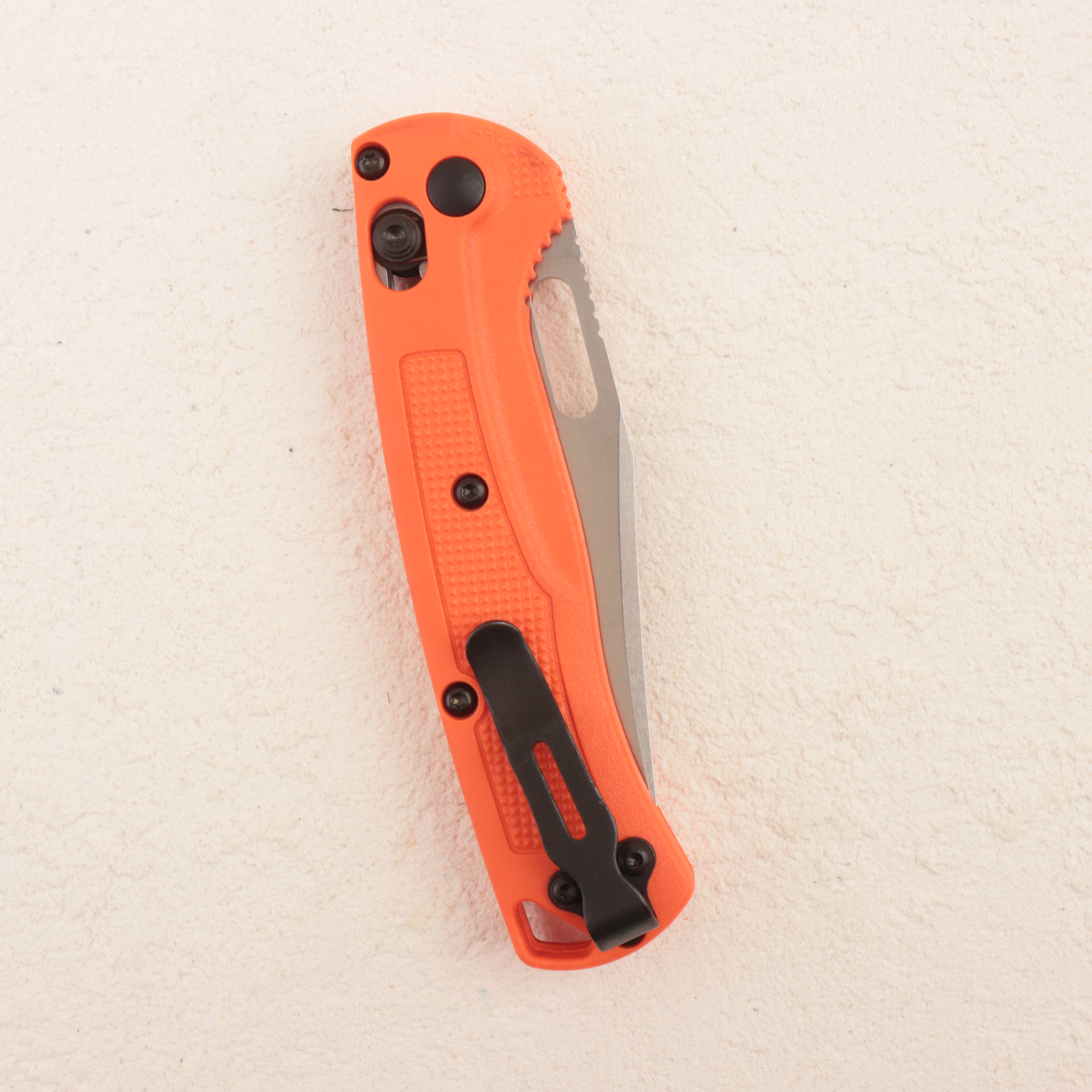 Главная особенность именно версии 15533 — рукоять из оранжевого Grivory. Это легкий и прочный полимер, который помогает сохранить минимальный вес ножа, а яркий сигнальный цвет делает его заметнее в траве, листве, на земле или среди снаряжения. Для охотничьего и полевого ножа это не просто декоративное решение, а вполне практичная деталь. Benchmade прямо подчеркивает, что текстурированная рукоять надежно удерживается в ладони в разную погоду, а сама концепция модели строится вокруг удобства в реальной полевой работе.