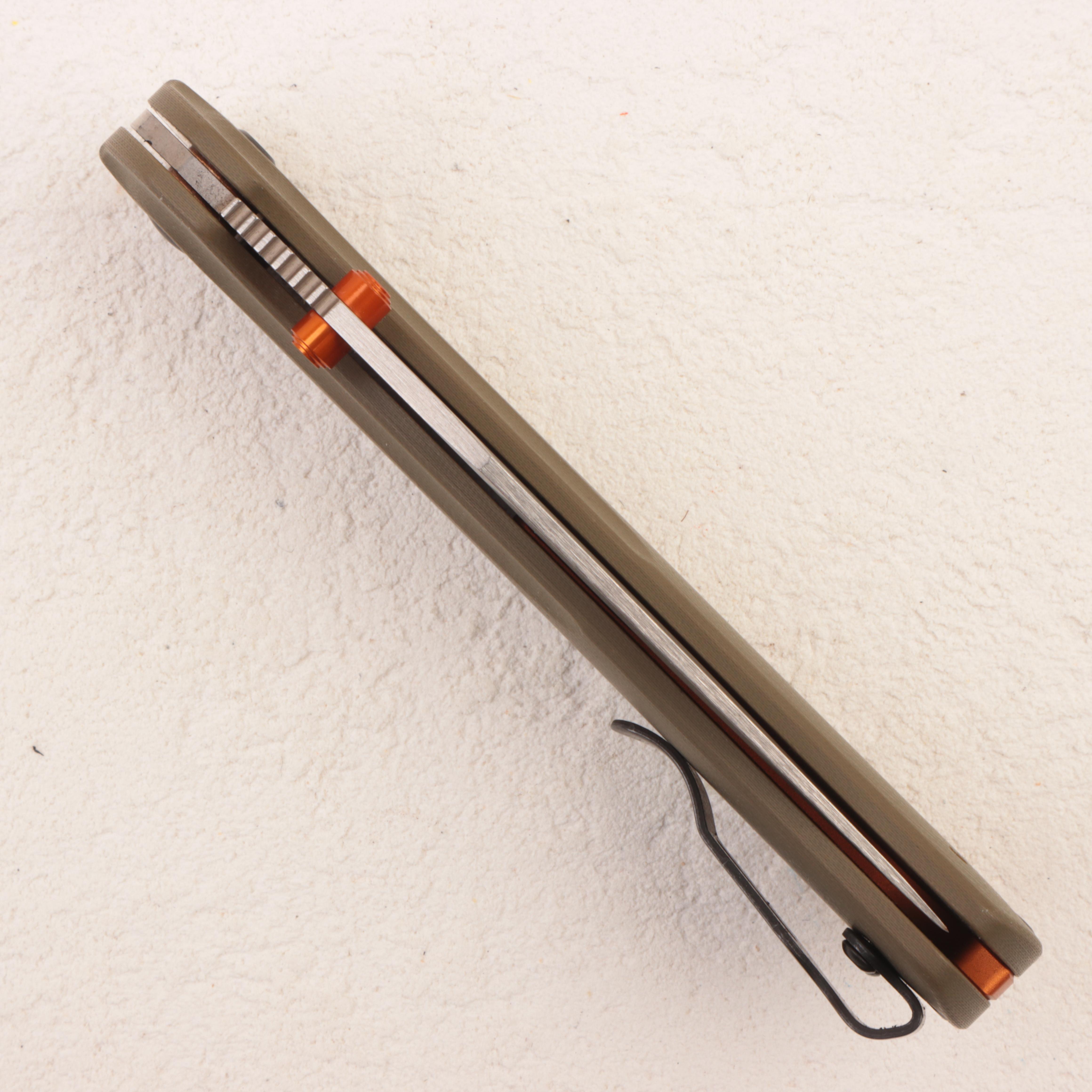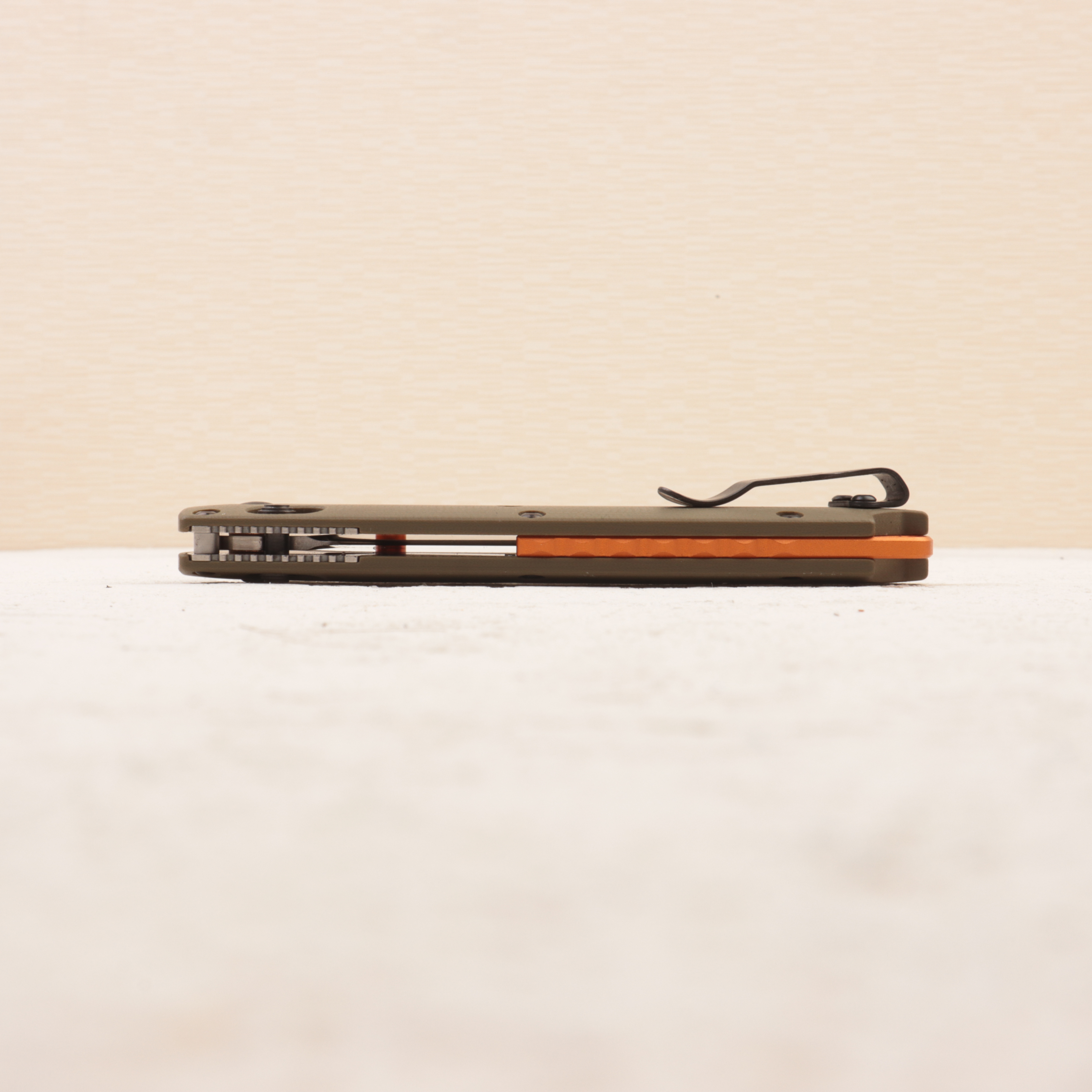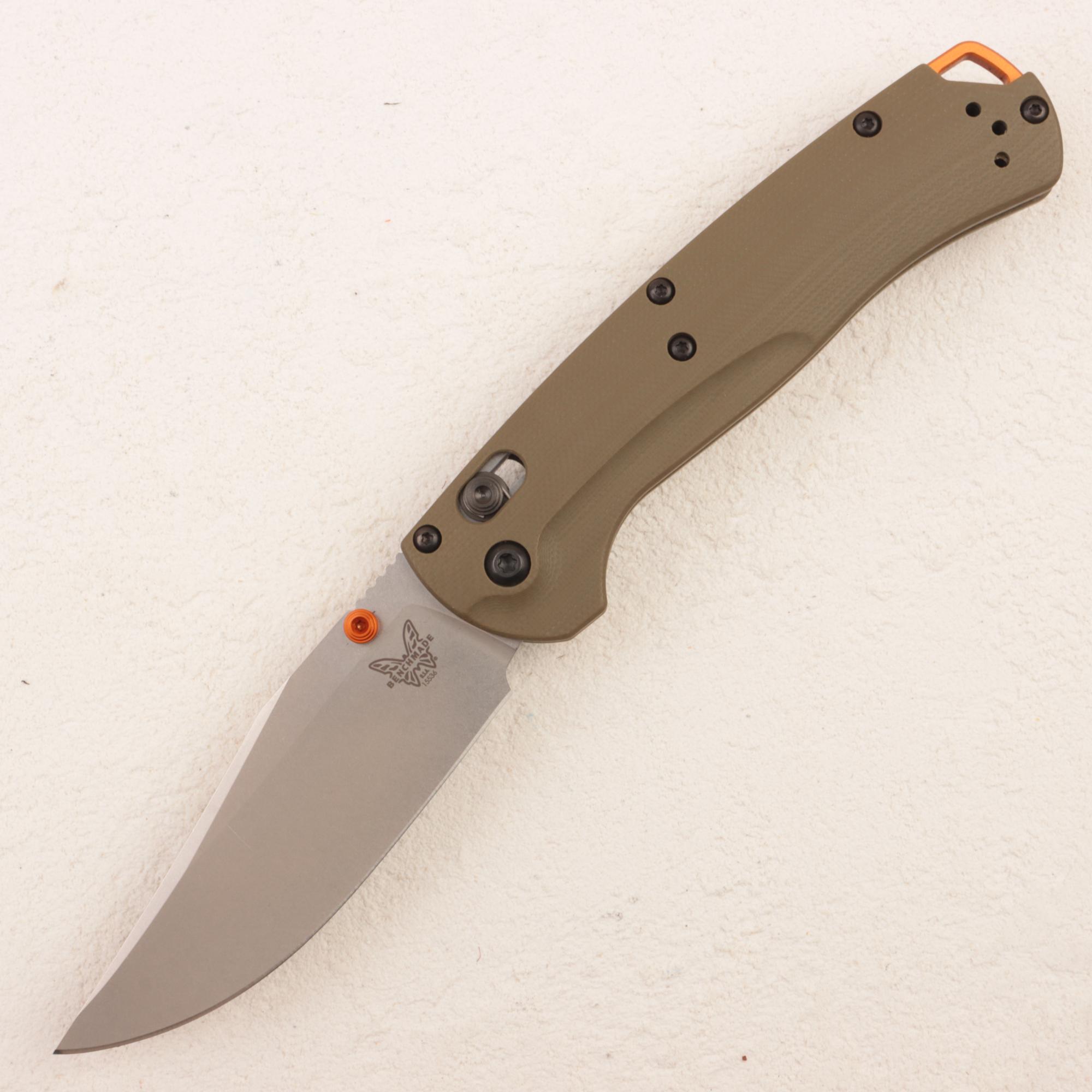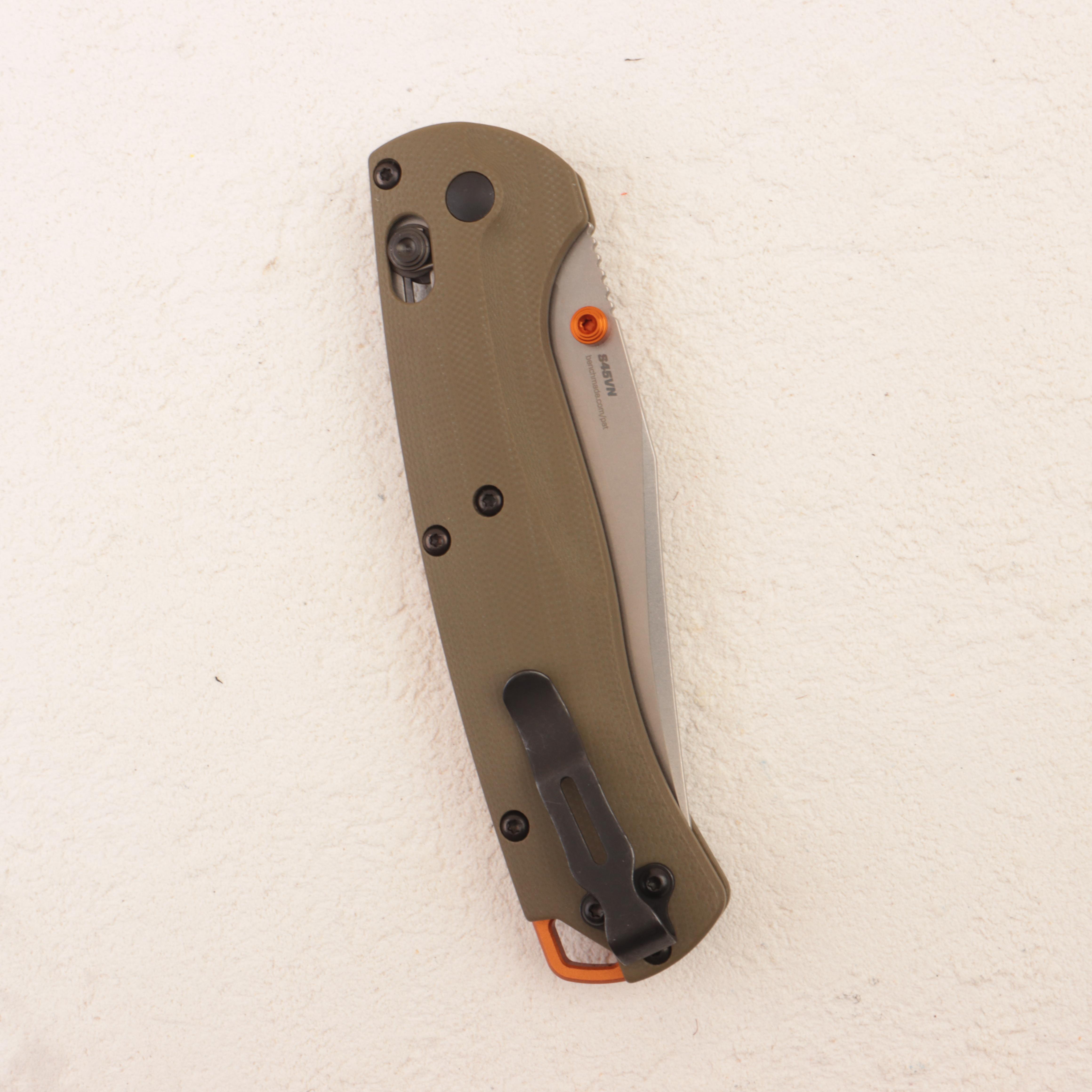 Главная особенность именно этого исполнения — рукоять из G10 цвета OD Green, то есть в оливково-зеленом оттенке. В отличие от более легких версий Taggedout с Grivory, здесь Benchmade делает ставку на более прочный и уверенный по ощущениям материал, поэтому нож воспринимается не просто как сверхлегкий охотничий складень, а как более универсальный инструмент для природы и города. Эту конфигурацию дополняют оранжевые анодированные акценты — шпенек и проставка, которые добавляют модели узнаваемости и улучшают визуальное восприятие в снаряжении.
