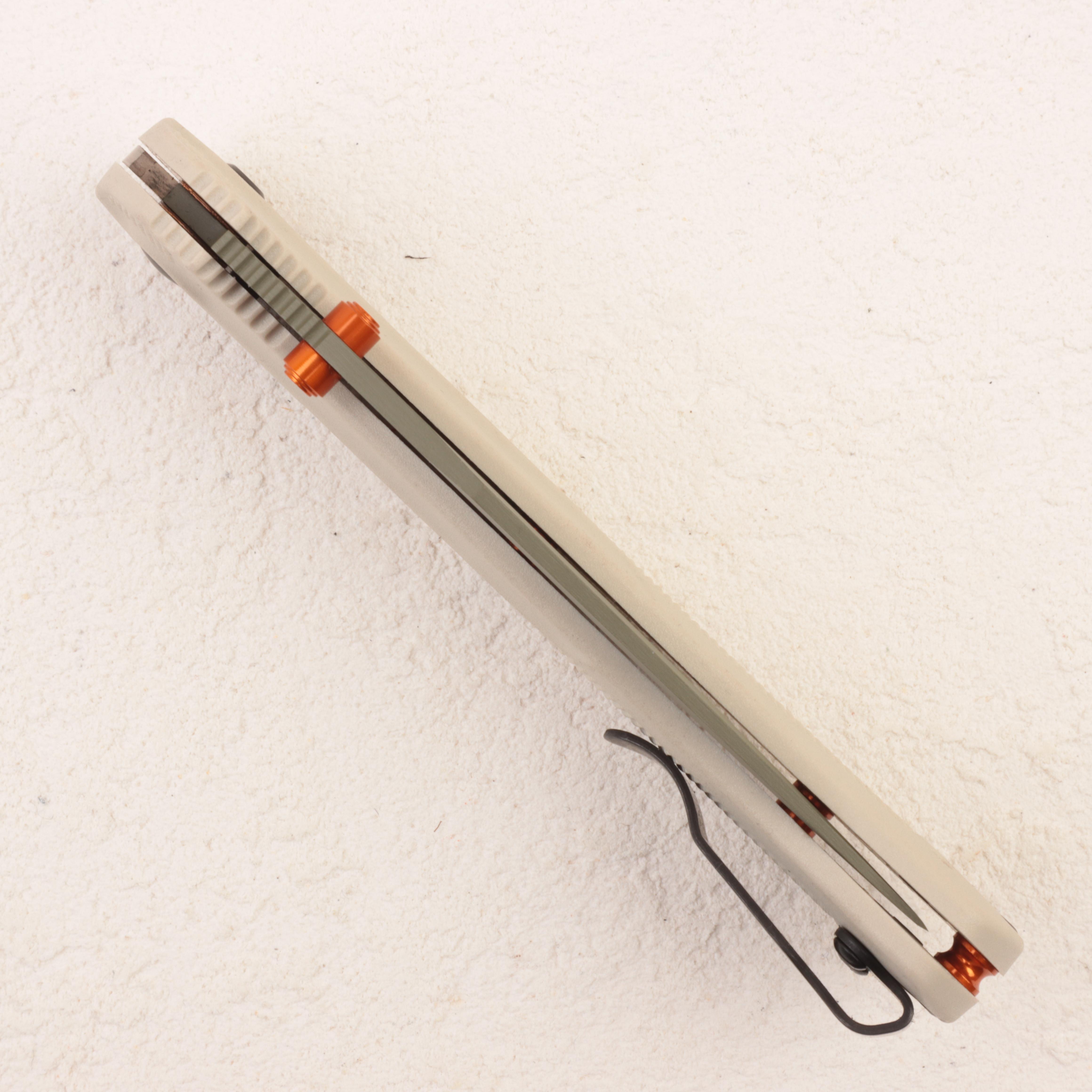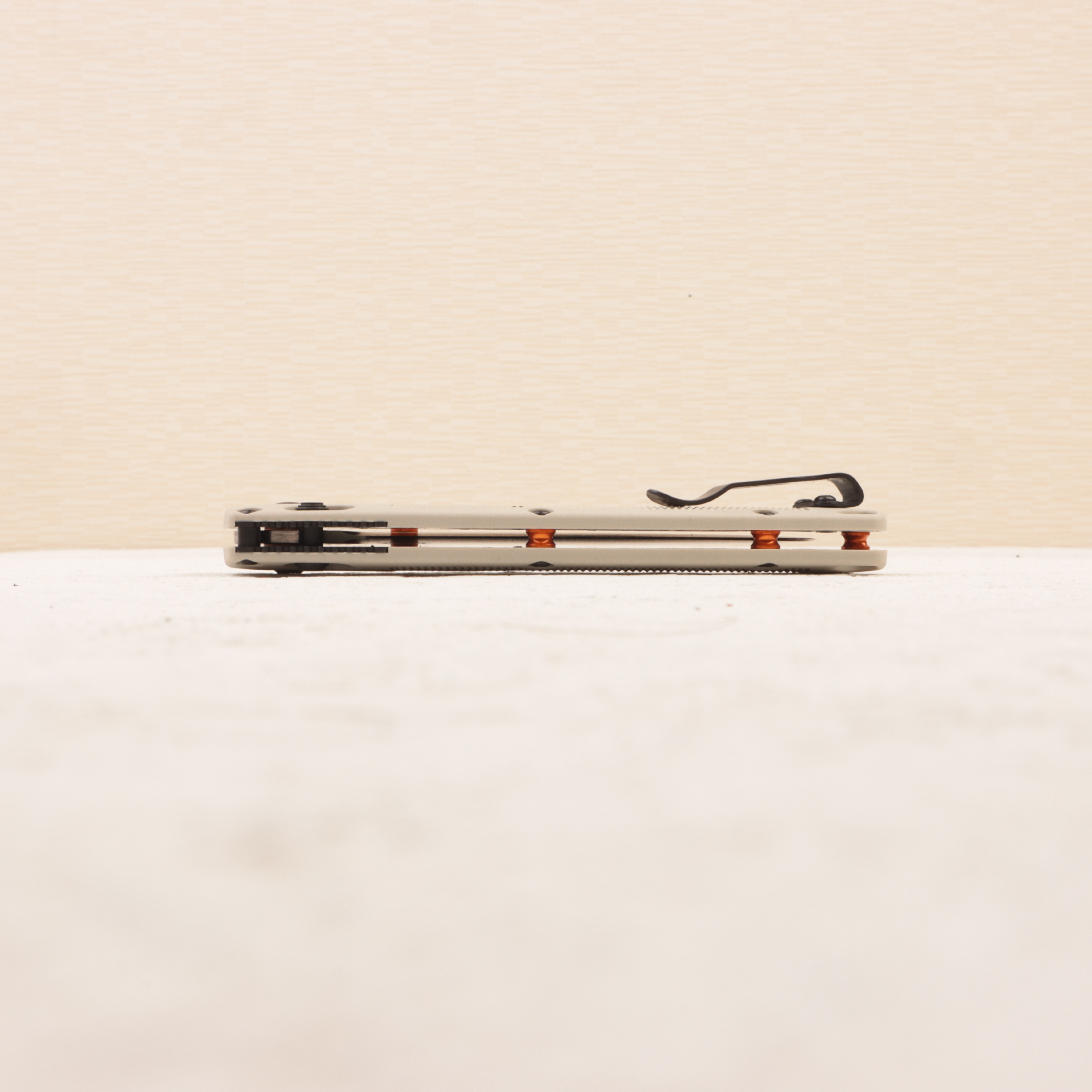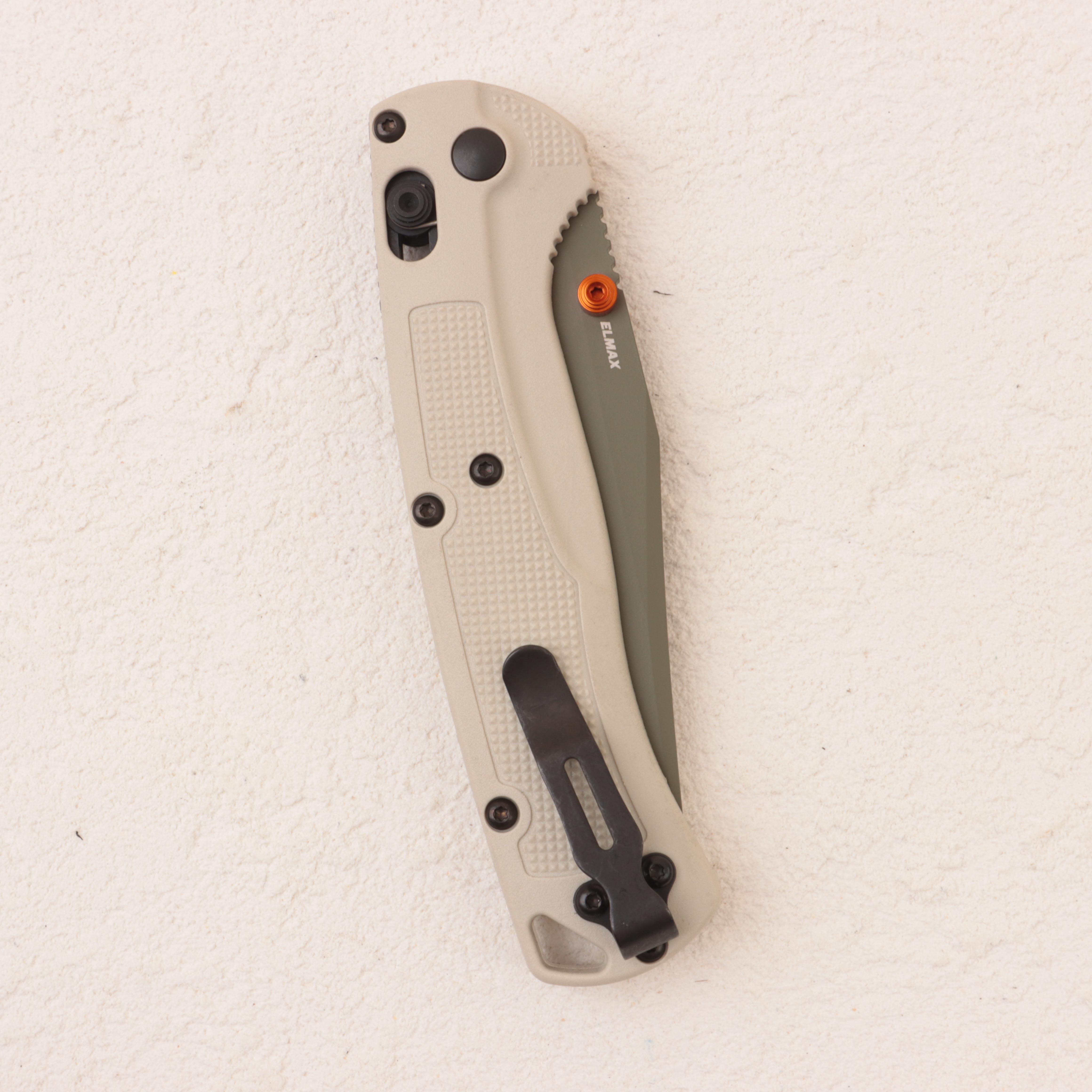 Главная особенность именно 15536GN-01 — сочетание сверхмалого веса и спокойной природной цветовой гаммы. Рукоять выполнена из Grivory песочно-бежевого цвета, а фурнитура дополнена черными элементами и оранжевыми анодированными акцентами на шпеньке и проставках. Benchmade отдельно подчеркивает, что эта версия рассчитана на ситуации, где в дикой природе важна меньшая заметность, поэтому нож задуман не как яркий сигнальный инструмент, а как более сдержанный и «полевой» вариант Taggedout. При этом Grivory выбран не только ради веса: он помогает сохранить жесткость конструкции и удобство хвата без утяжеления ножа.