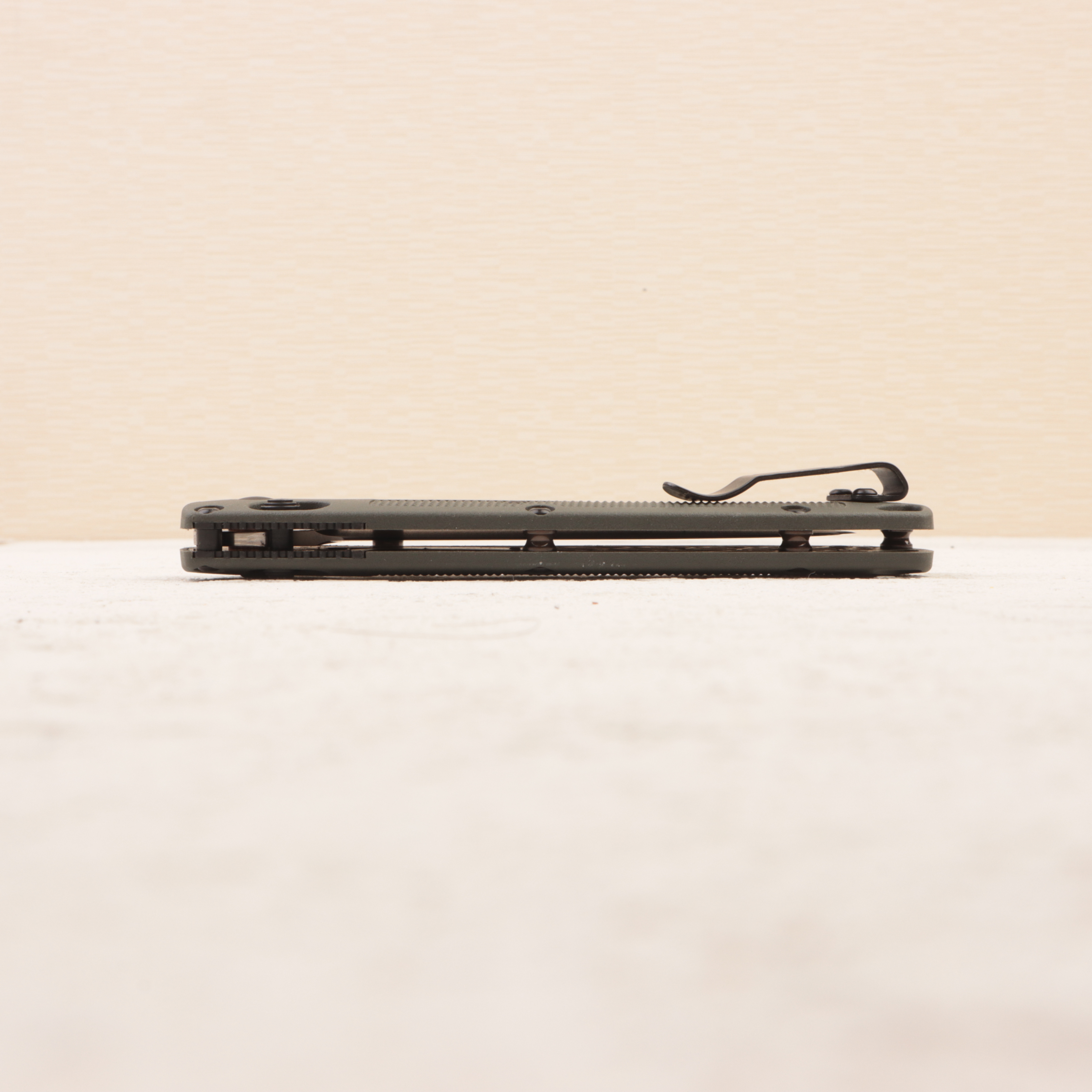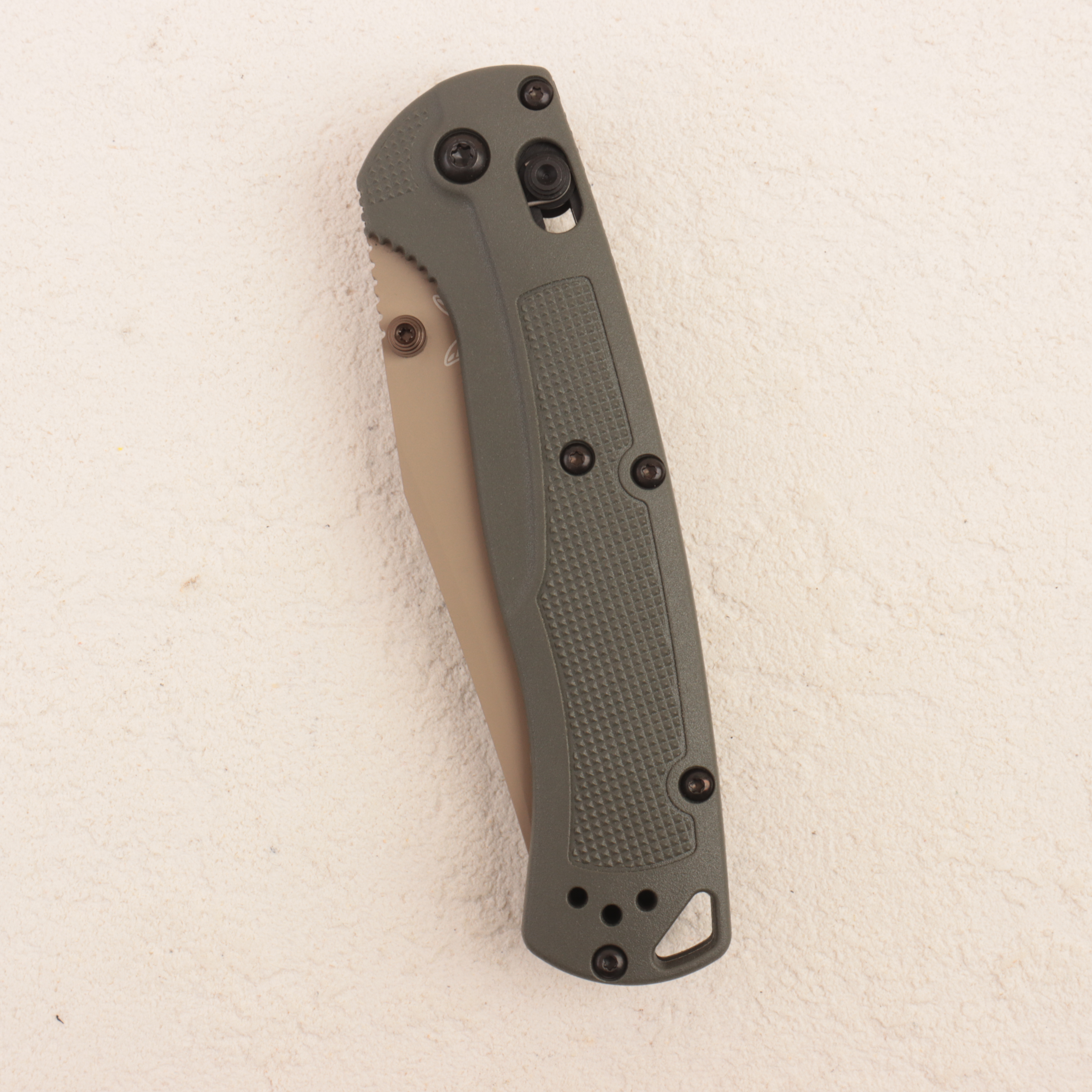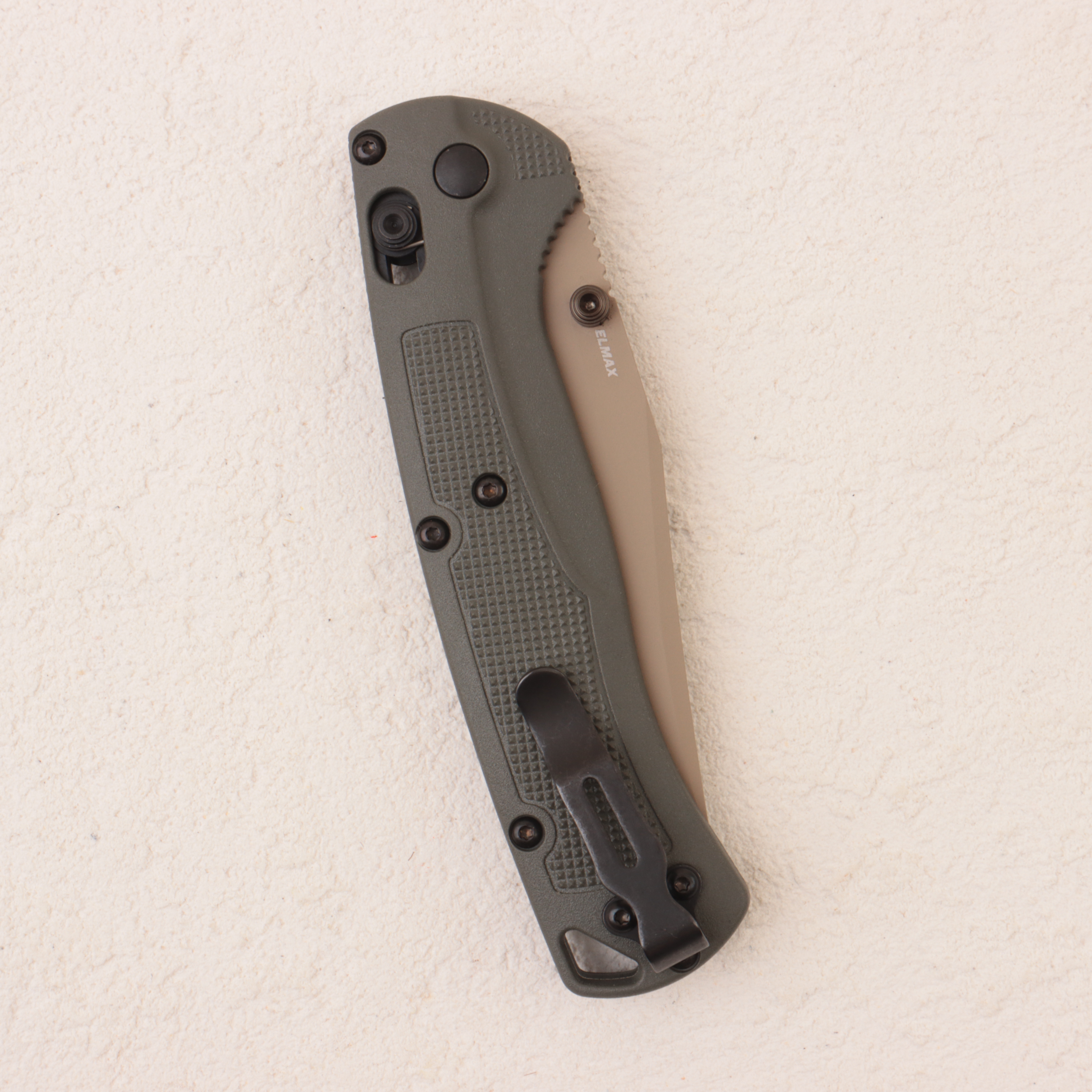 Главная особенность именно 15536TN-02 — сочетание очень малого веса и явно полевого характера. Рукоять выполнена из Grivory в цвете глубокий оливковый, а фурнитура дополняется темными элементами и анодированными вставками в оливковом оттенке. Benchmade и магазины отдельно подчеркивают, что эта конфигурация задумана как малозаметная в природной среде, но дело не только в цвете: Grivory помогает сохранить нож очень легким, при этом рукоять остается достаточно жесткой и практичной для реальной работы. За открывание отвечает двусторонний шпенек, конструкция построена на AXIS Lock, а клипса глубокого ношения переставляется под правую и левую руку.