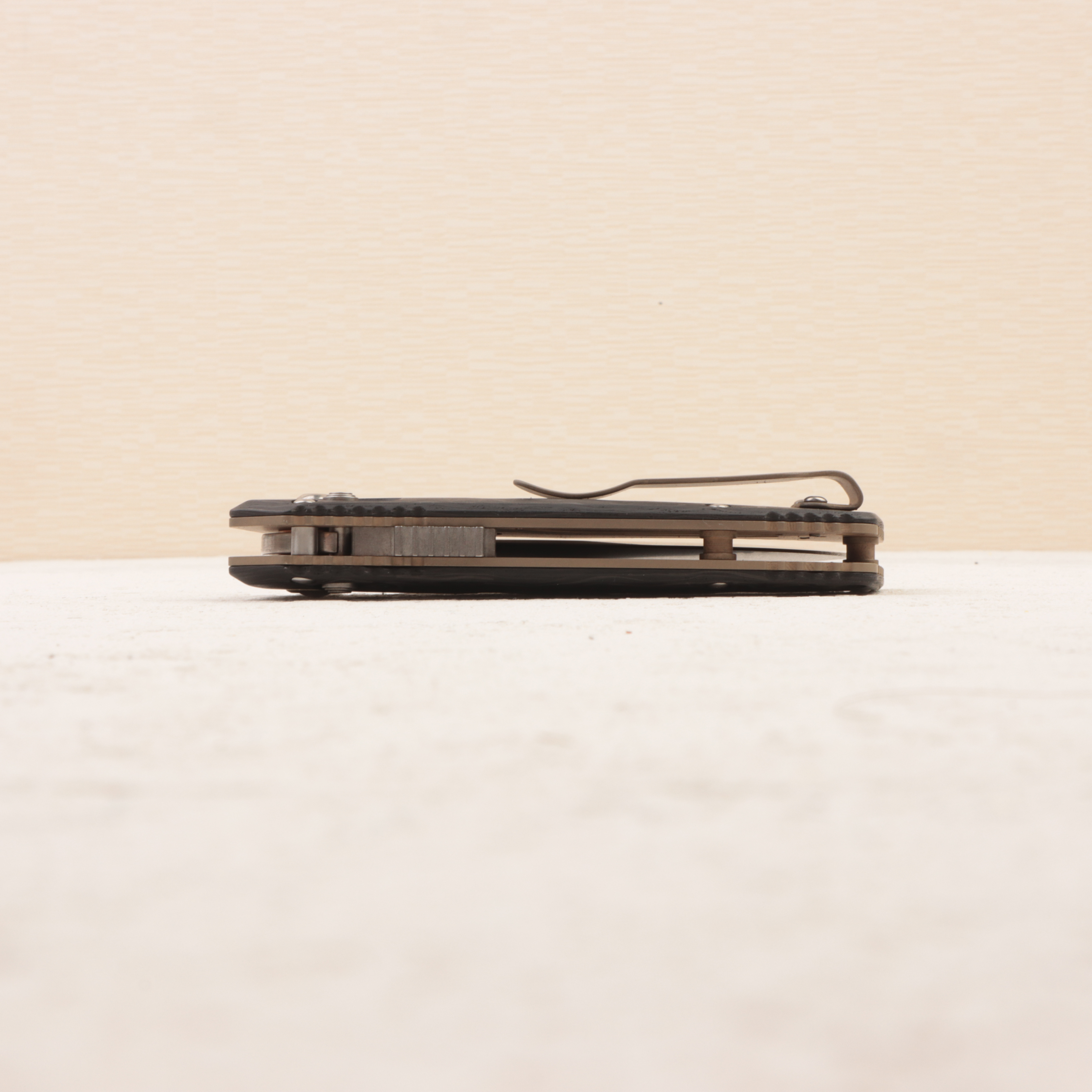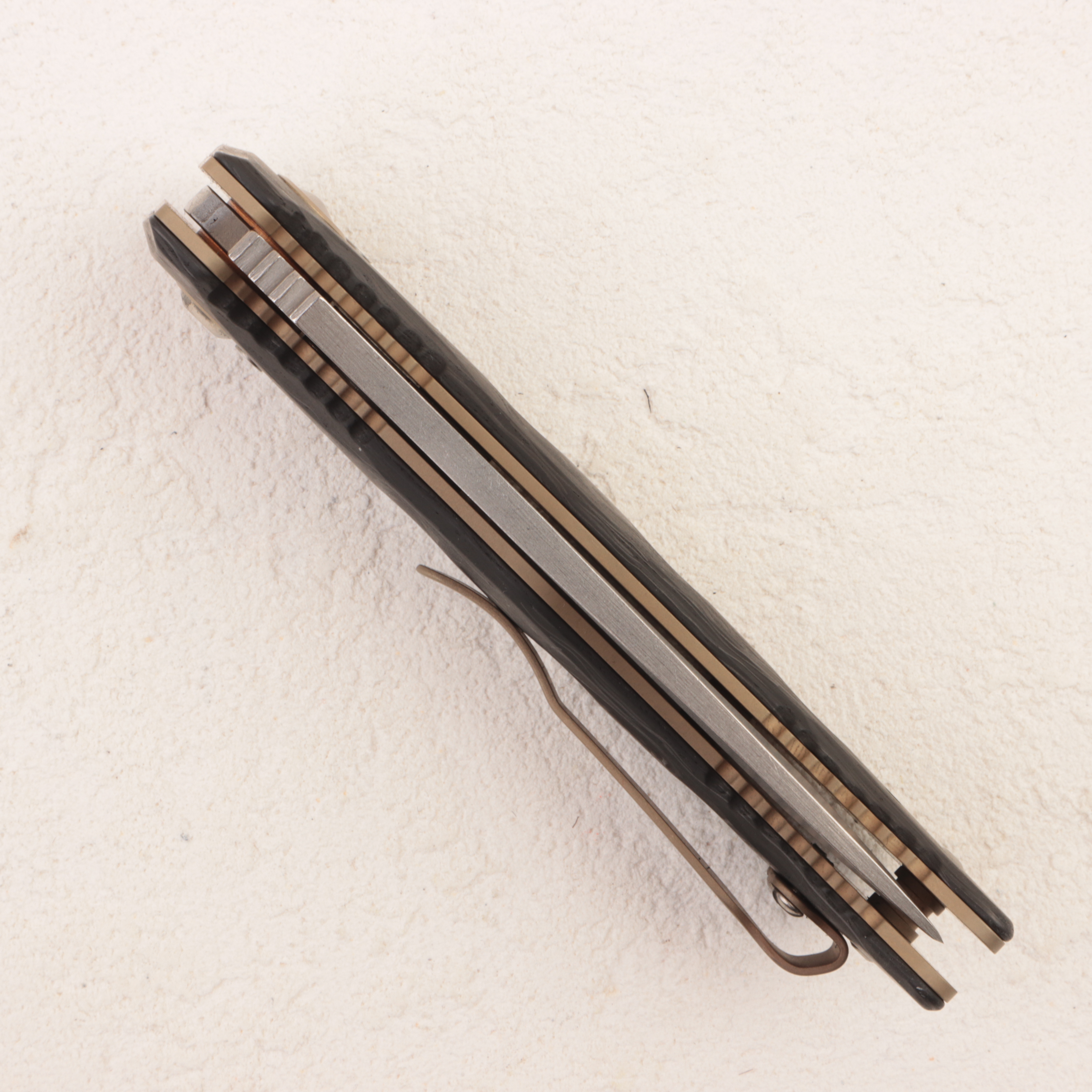 Главная особенность именно 2730-03 — рукоять из мраморного карбона. На фоне более утилитарных версий Mini Auto Adamas с G10 или другими практичными материалами эта модификация выглядит заметно благороднее и дороже, но при этом не теряет фирменной массивности и собранности. Benchmade прямо подчеркивает, что здесь сочетаются автоматическая механика Auto AXIS и карбоновая рукоять с более выразительной фурнитурой, а сторонние продавцы уточняют, что внутри используются лайнеры в оттенке Flat Dark Earth, которые добавляют конструкции прочности и подчеркивают премиальный характер исполнения.