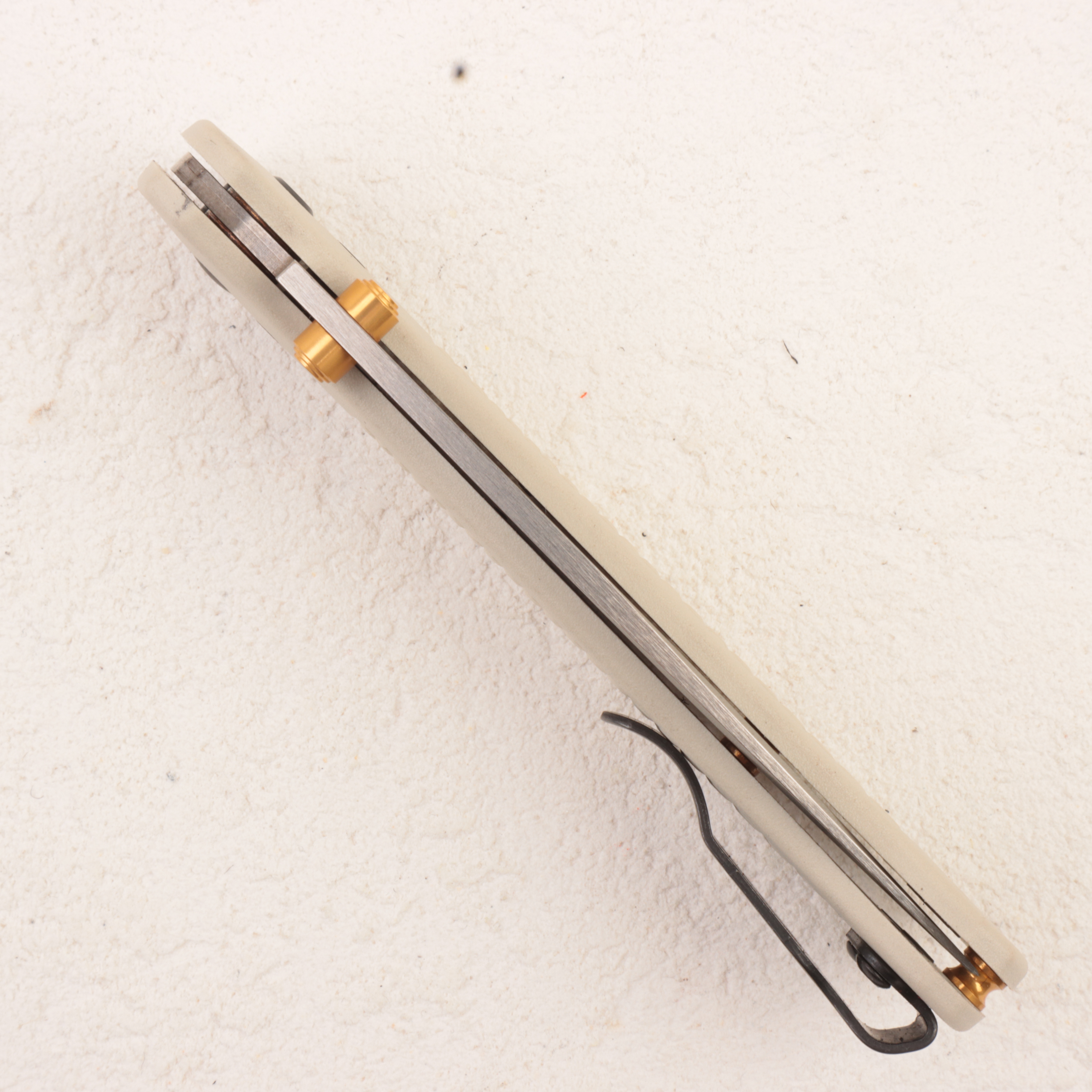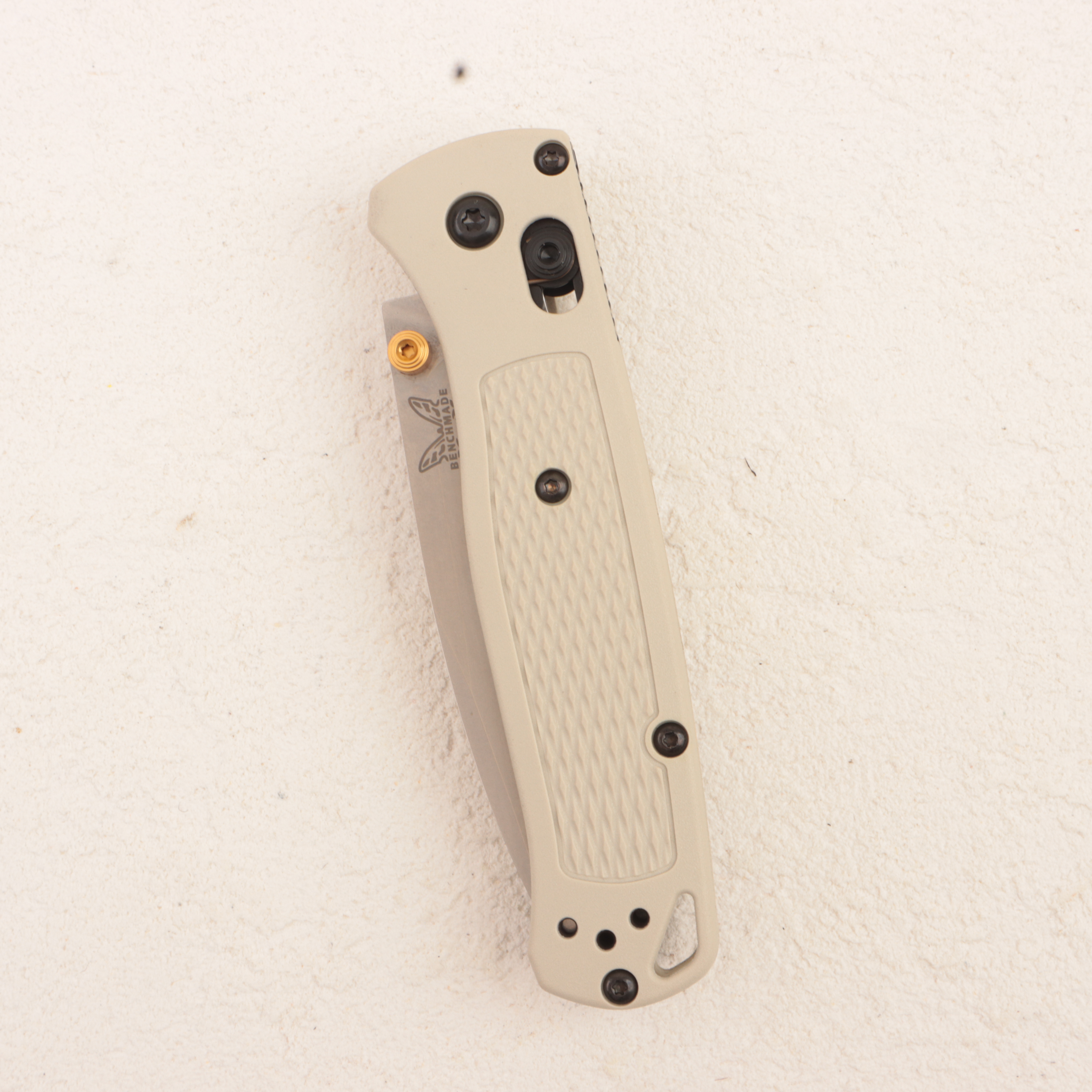 Главная особенность именно 535-12 — рукоять из Tan Grivory. Этот материал Benchmade использует в Bugout не случайно: Grivory позволяет сохранить минимальный вес, при этом рукоять остается достаточно жесткой и удобной для повседневных задач. В этой версии tan-оттенок дополнен контрастными gold anodized элементами — шпеньком и бэкспейсерами, за счет чего нож выглядит заметно интереснее базовых исполнений, но при этом не теряет фирменной простоты. Конструкция построена на AXIS Lock, нож открывается двусторонним шпеньком, а для ношения предусмотрена переставляемая клипса mini deep-carry tip-up, поэтому модель одинаково удобна и для правши, и для левши.