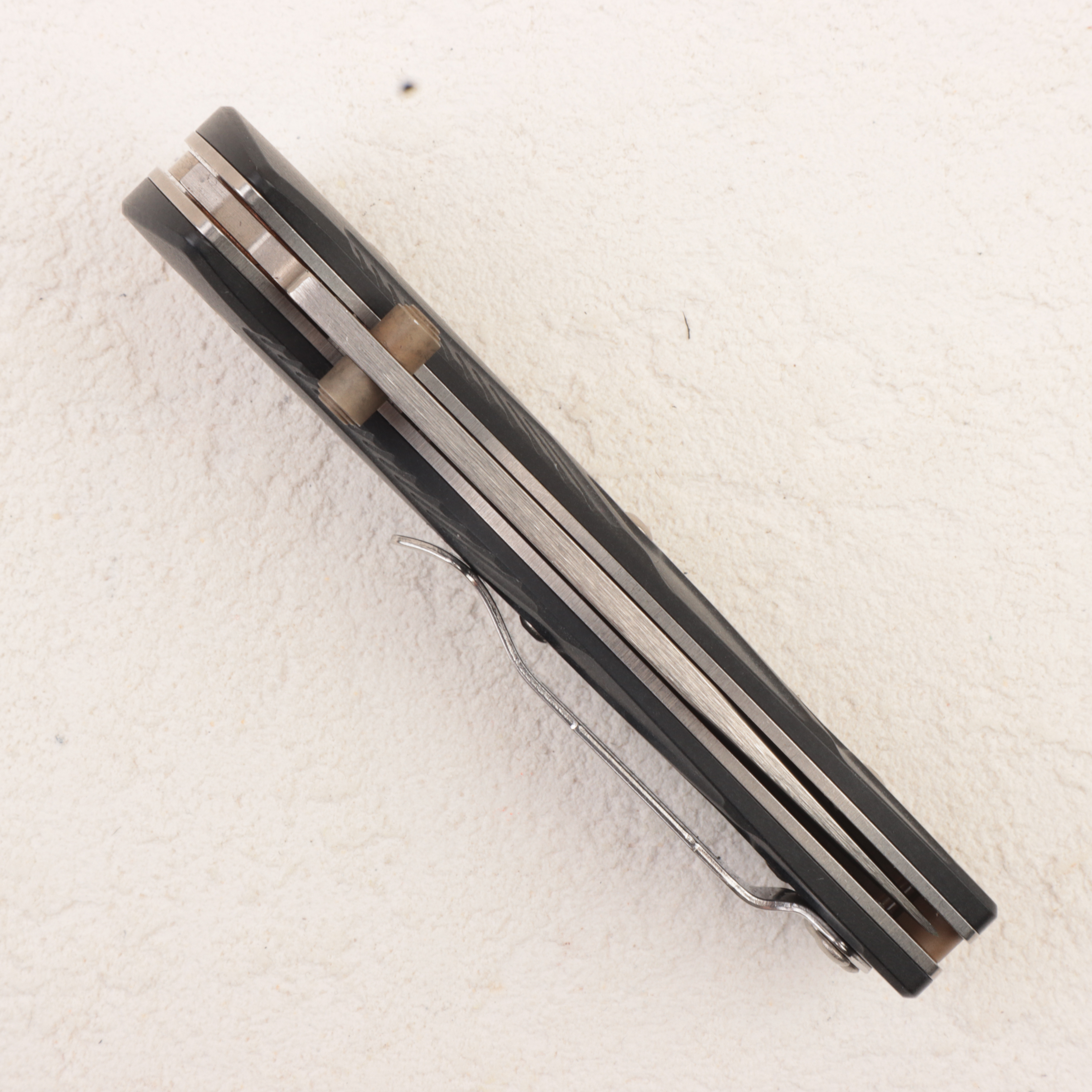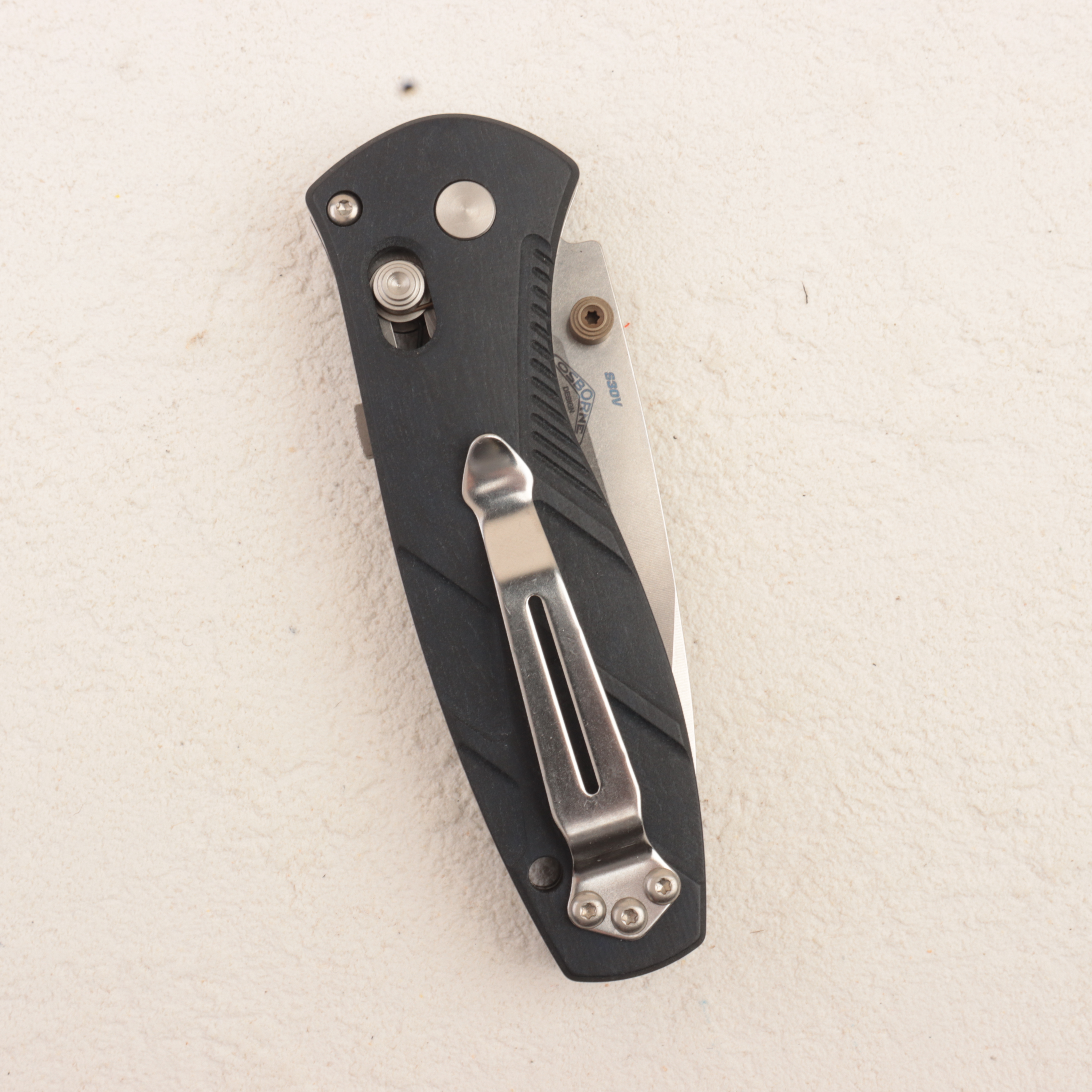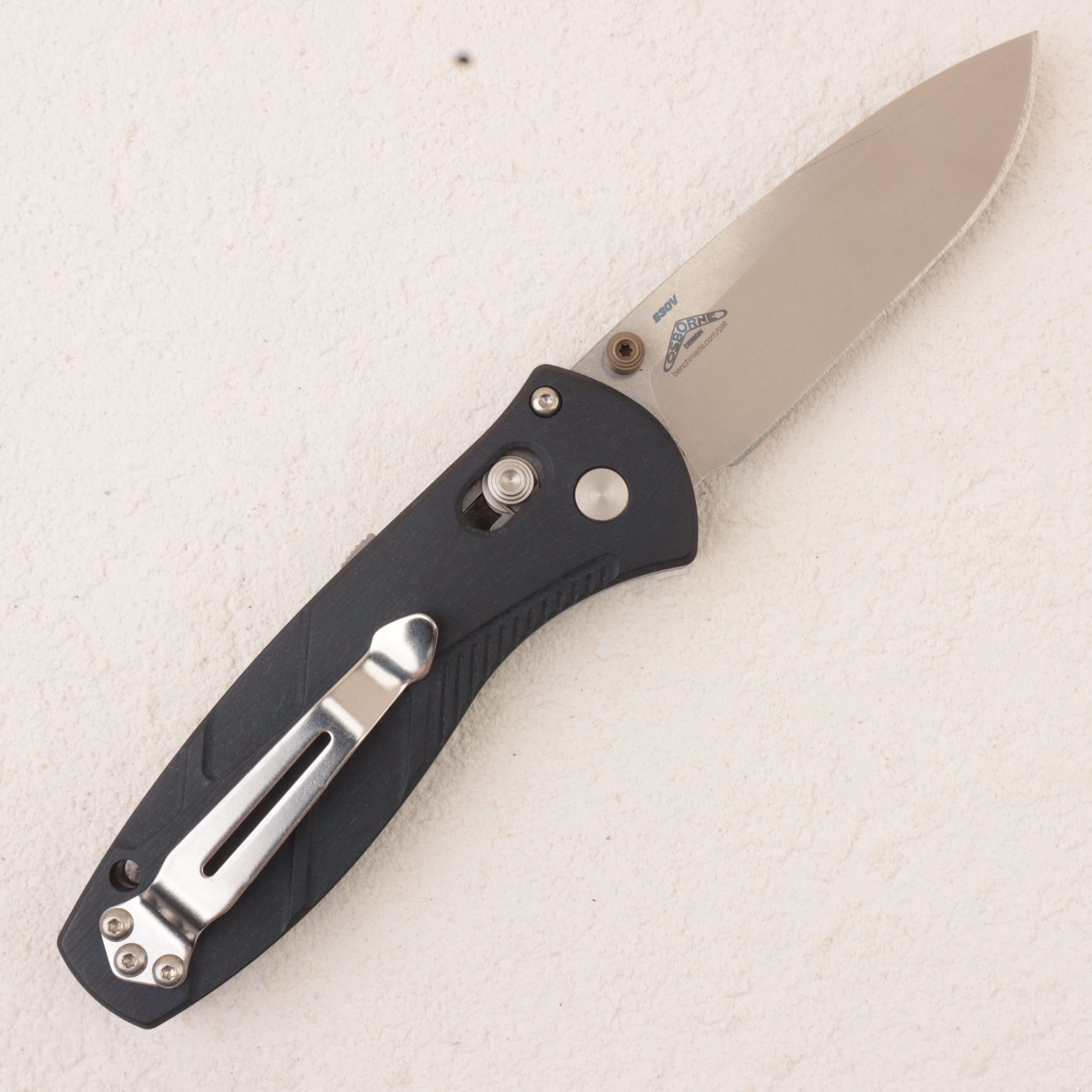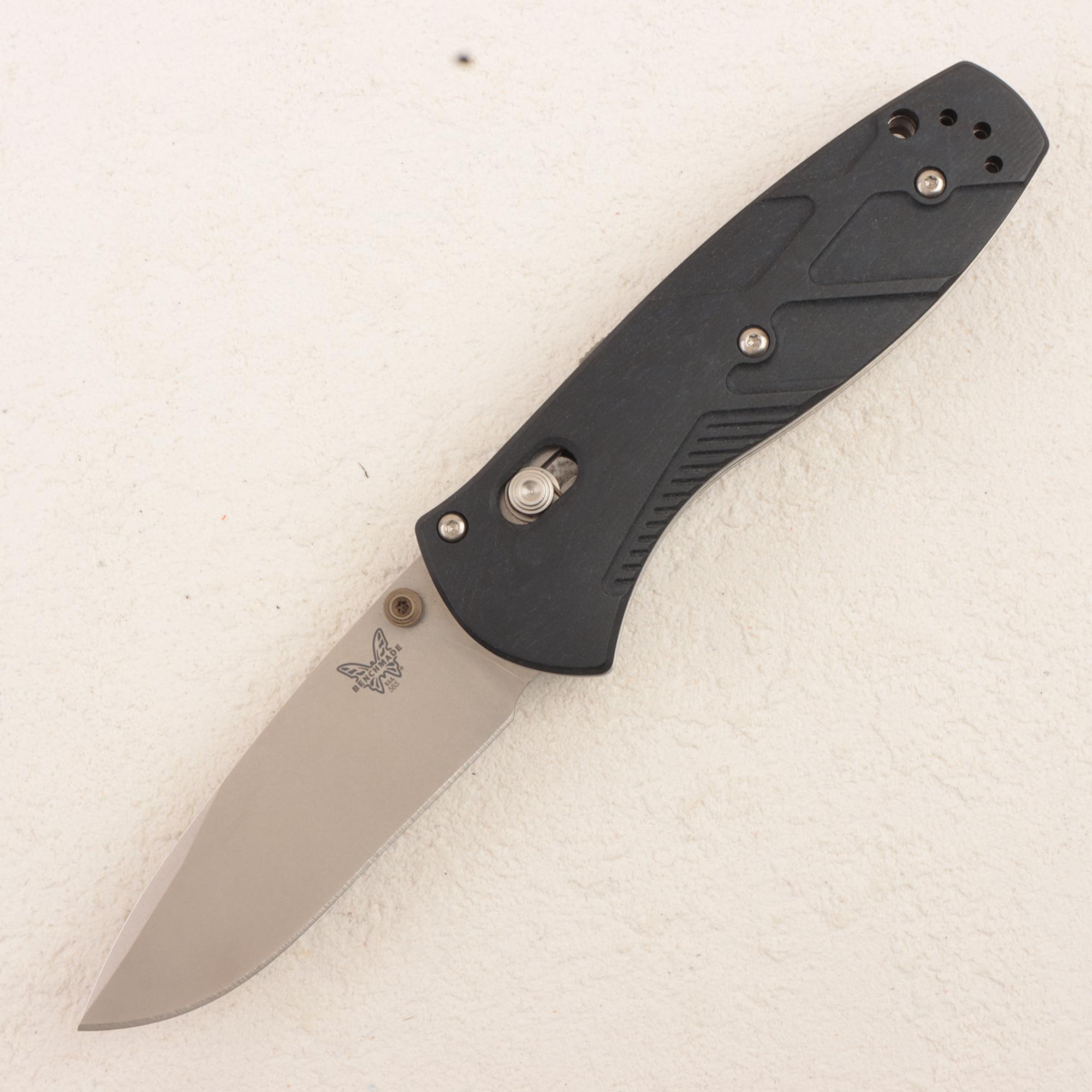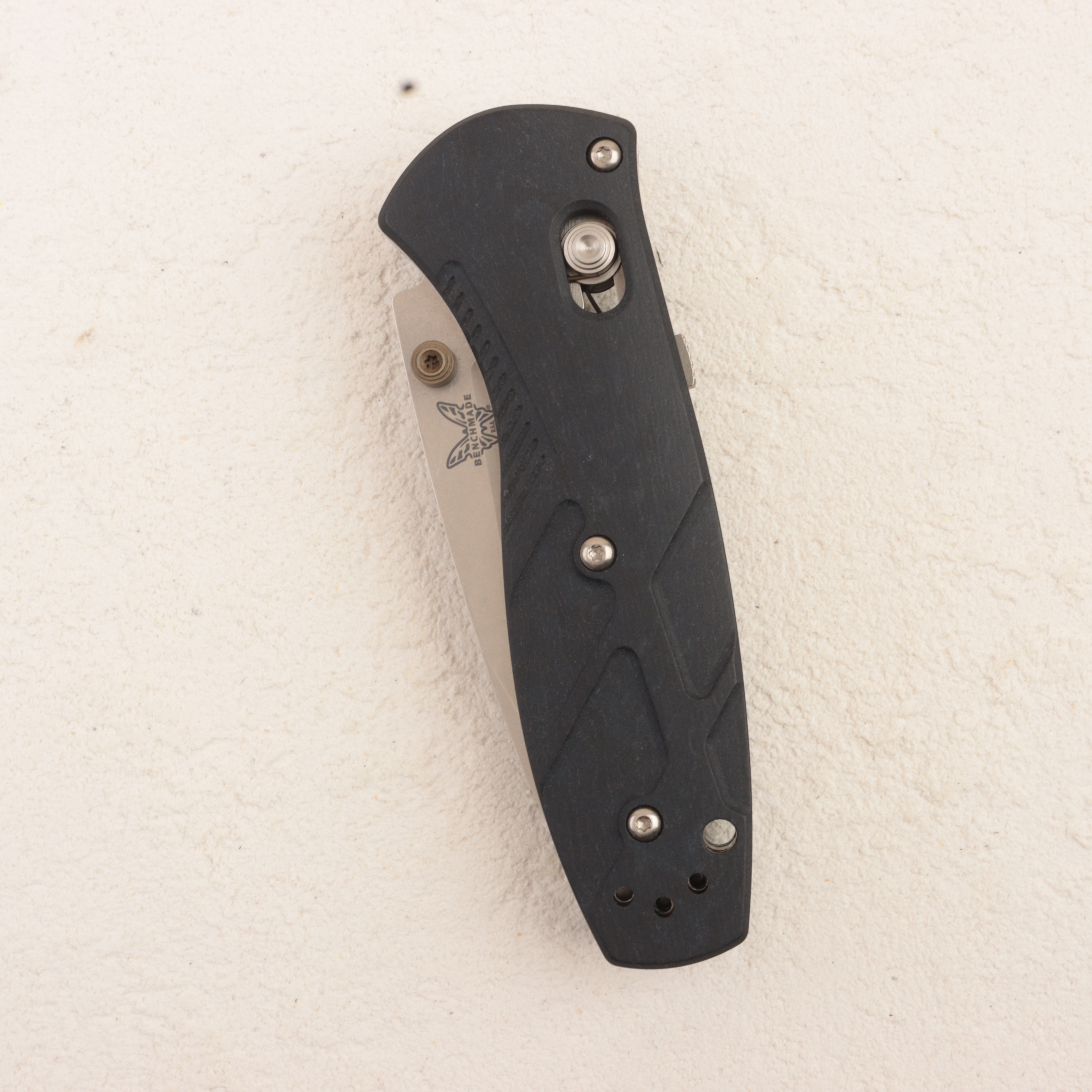 Главная особенность именно этой версии — рукоять из Blue Canyon Richlite. Benchmade и профильные магазины подчеркивают, что здесь используются фрезерованные накладки Richlite, дополненные Flat Dark Earth-анодированными шпеньками, благодаря чему нож выглядит заметно интереснее базовых синтетических исполнений. Richlite дает модели более «теплый» и необычный характер по сравнению с обычным Grivory или G10, но при этом сохраняет практичность, цепкость и уместность для реального EDC-использования.