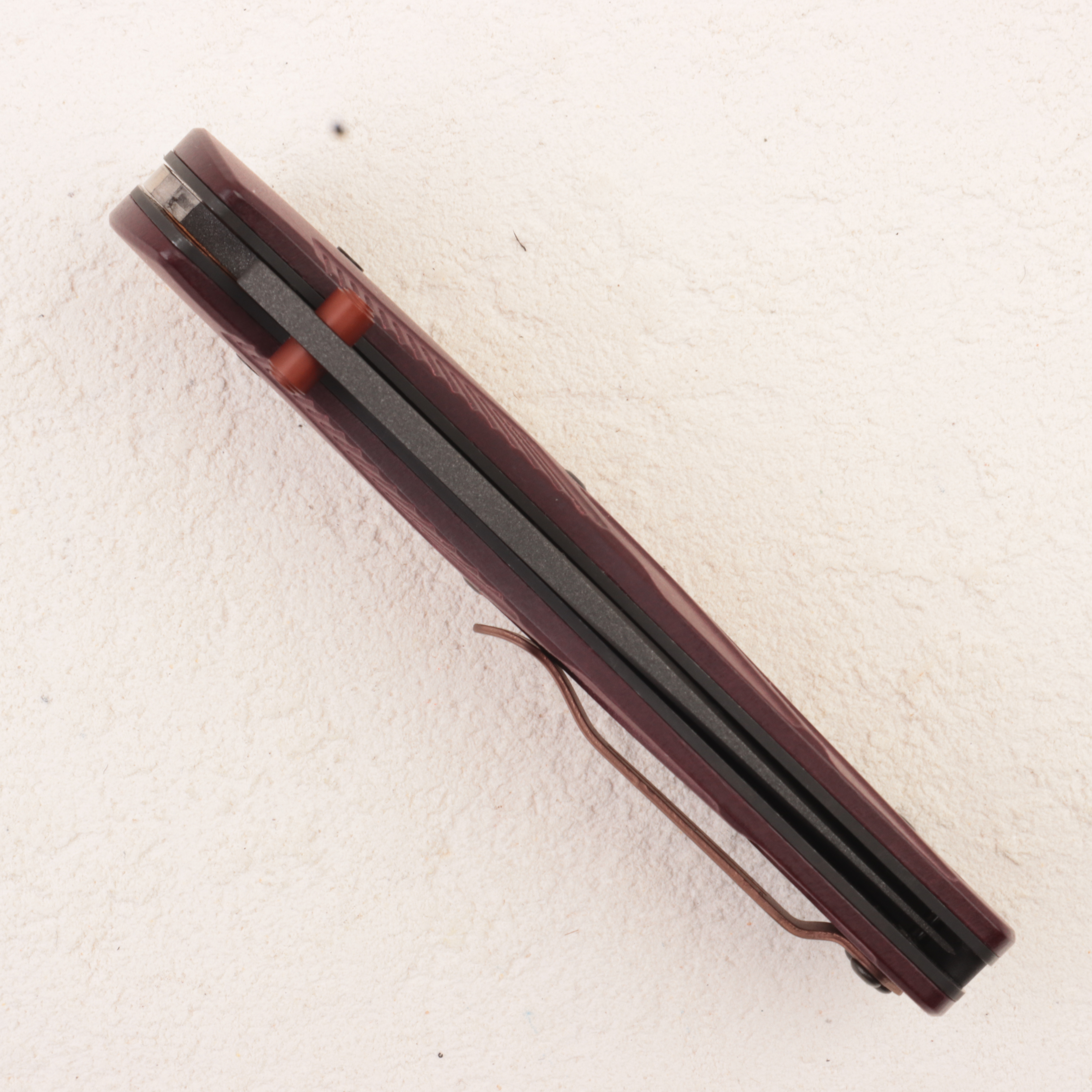 Главная особенность именно 581BK-04 — рукоять из Redstone Richlite со стальными лайнерами. Richlite придает ножу более необычный внешний вид и приятную тактильность, а в этой версии Benchmade дополнили его акцентами в темно-медном оттенке: профильные магазины отдельно отмечают burnt copper-шпеньки, темный бэкспейсер и клипсу с медным PVD-финишем. За счет этого нож выглядит не просто как очередной Barrage, а как более «собранное» и стилистически цельное исполнение классической модели. При этом по эргономике он остается тем самым Barrage — с уверенным хватом, полноразмерной рукоятью и посадкой клипсы tip-up с перестановкой под правую и левую руку.