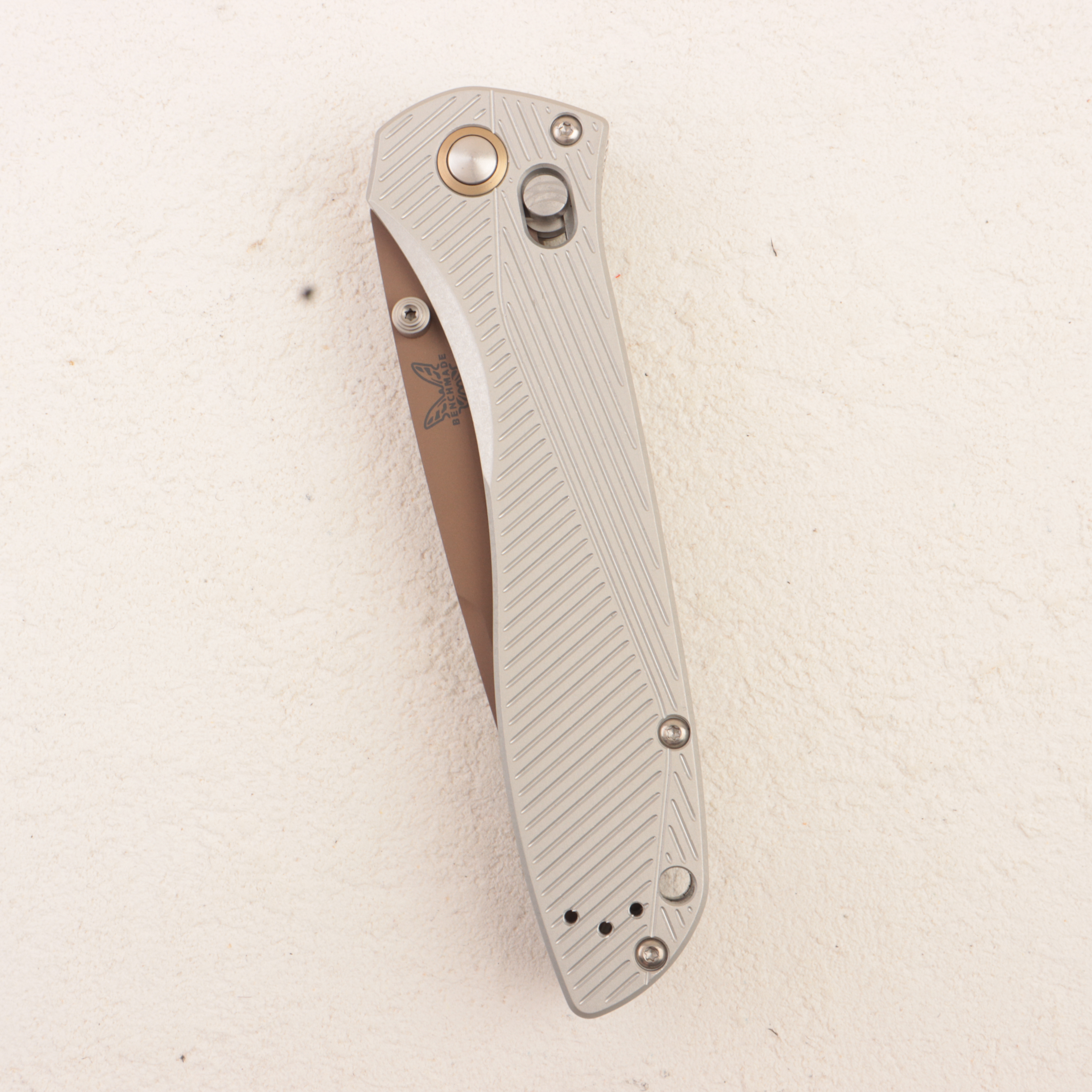 Одной из особенностей именно этого исполнения стала рукоять из серого анодированного алюминия 6061-T6. За счет алюминия нож остается сравнительно легким для своего крупного формата и ощущается более практичным в повседневном использовании, чем многие массивные складни схожего размера. При этом Benchmade сохранили фирменную подачу модели: длинный рекурвный клинок, выразительный силуэт и глубокую клипсу tip-up с возможностью перестановки под правую и левую руку.