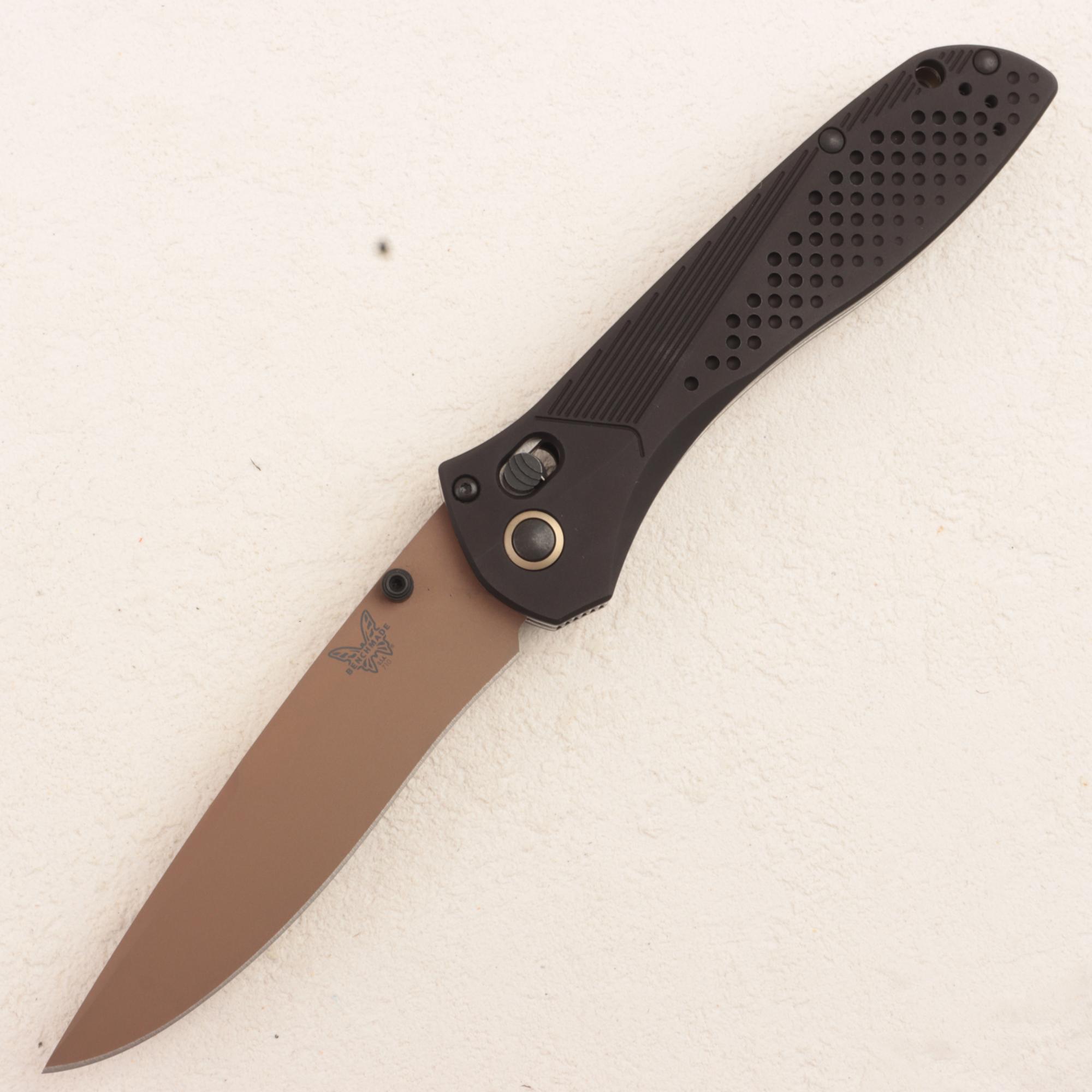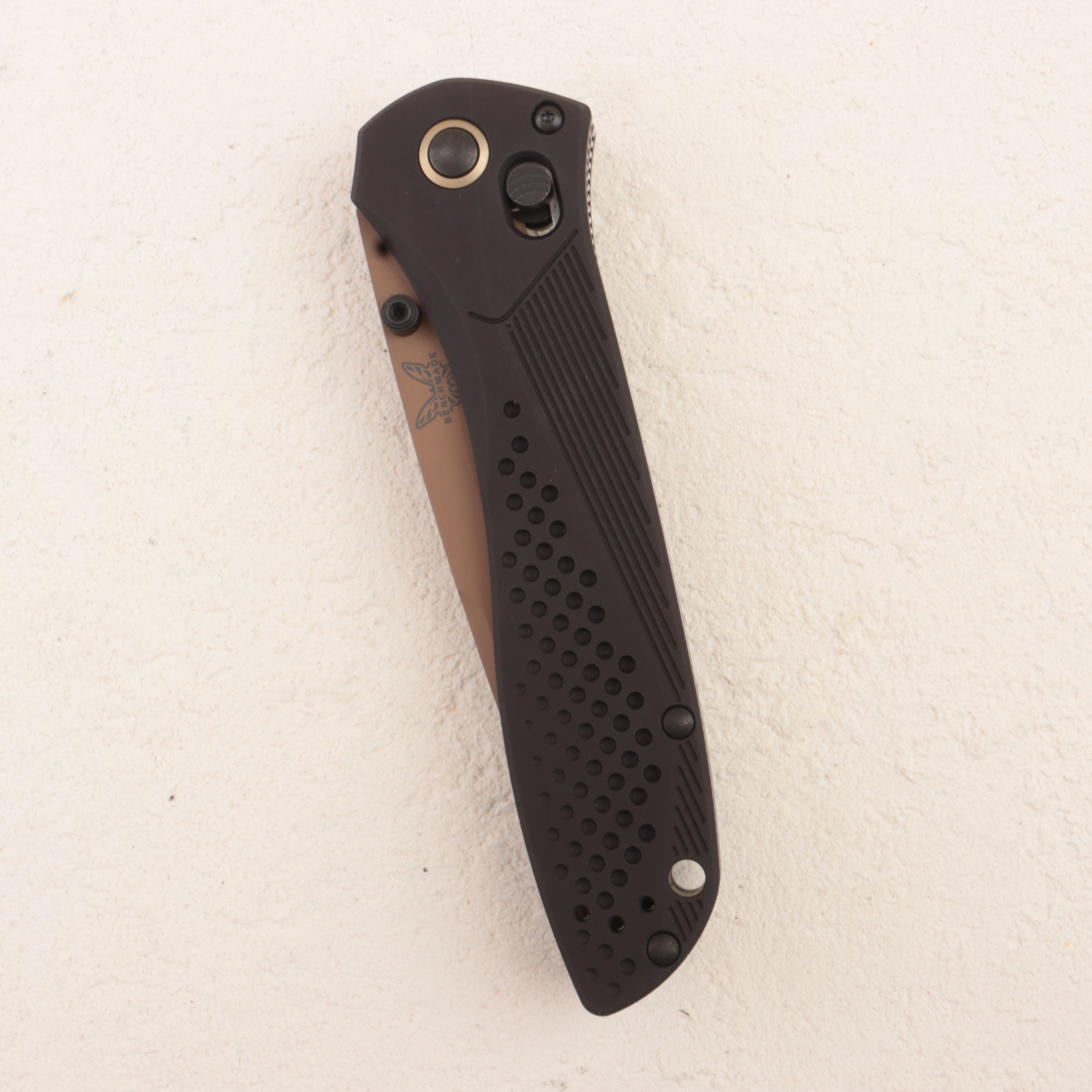 Отдельно стоит отметить рукоять: в версии 710FE-2401 она выполнена из черного фрезерованного алюминия, что делает нож заметно легче и практичнее, чем многие массивные премиальные складни такого размера. Визуально модель построена на контрасте черной рукояти и клинка в оттенке Flat Earth, а также дополнена темными и бронзово-песочными акцентами вроде проставки и кольца осевого узла. Именно это исполнение Benchmade и профильные магазины подают как limited edition 2024, то есть как лимитированную юбилейную модификацию внутри обновленной линейки SEVEN|TEN.