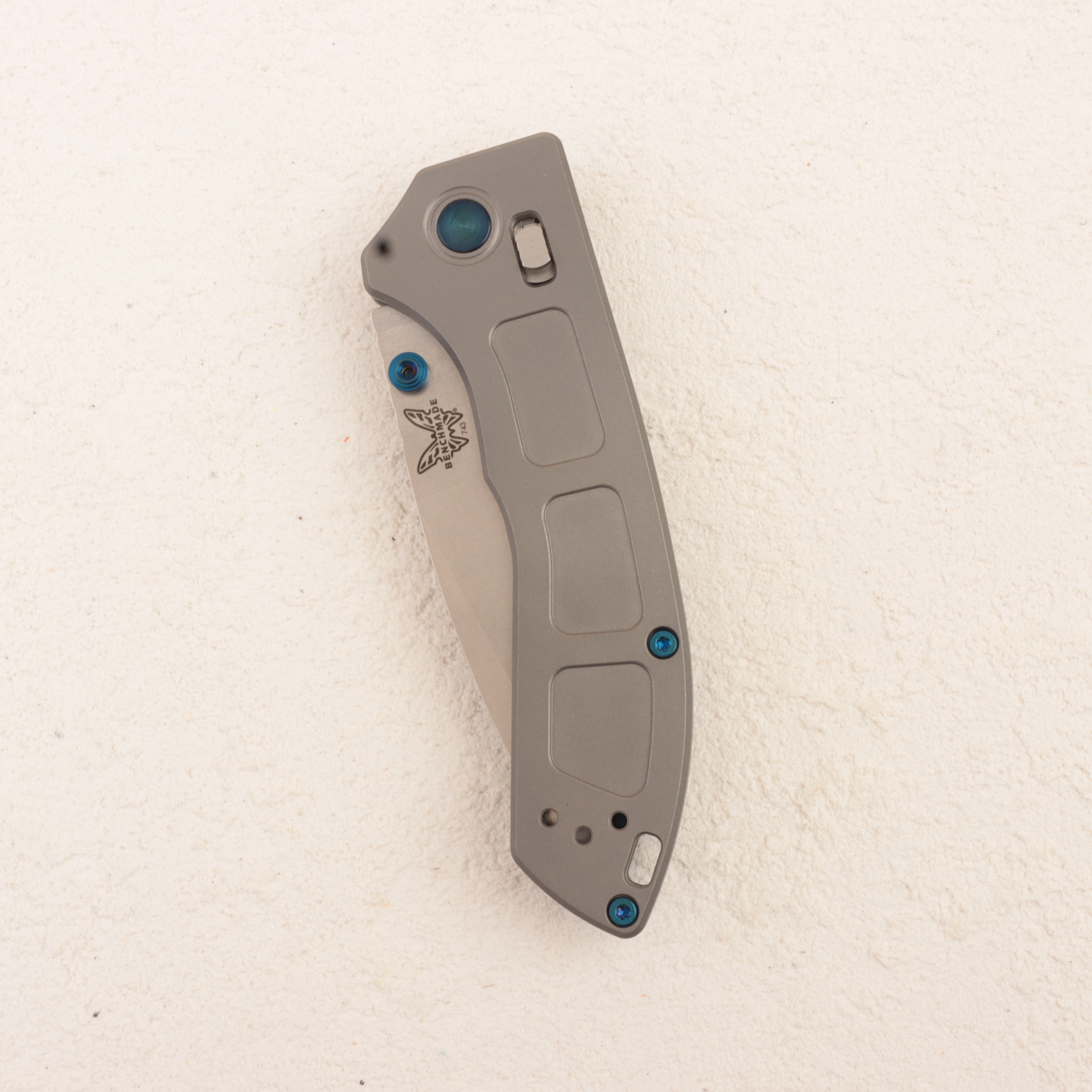 По конструкции 743 Mini Narrows — это уже не просто «маленький красивый нож», а именно дорогой компактный EDC с полноценной механикой Benchmade. Клинок длиной около 76 мм выполнен в форме drop point, имеет толщину всего около 2 мм и изготовлен из CPM-20CV с твердостью порядка 59–61 HRC, что дает модели очень хороший баланс между удержанием заточки, коррозионной стойкостью и повседневной практичностью. Общая длина ножа составляет примерно 181 мм, в сложенном виде он занимает около 103 мм, а весит всего около 55 г, то есть в кармане Mini Narrows ощущается практически невесомым. Для серой версии 743 используется светлый stonewash-финиш клинка, который хорошо сочетается с «чистой» титановой эстетикой модели.