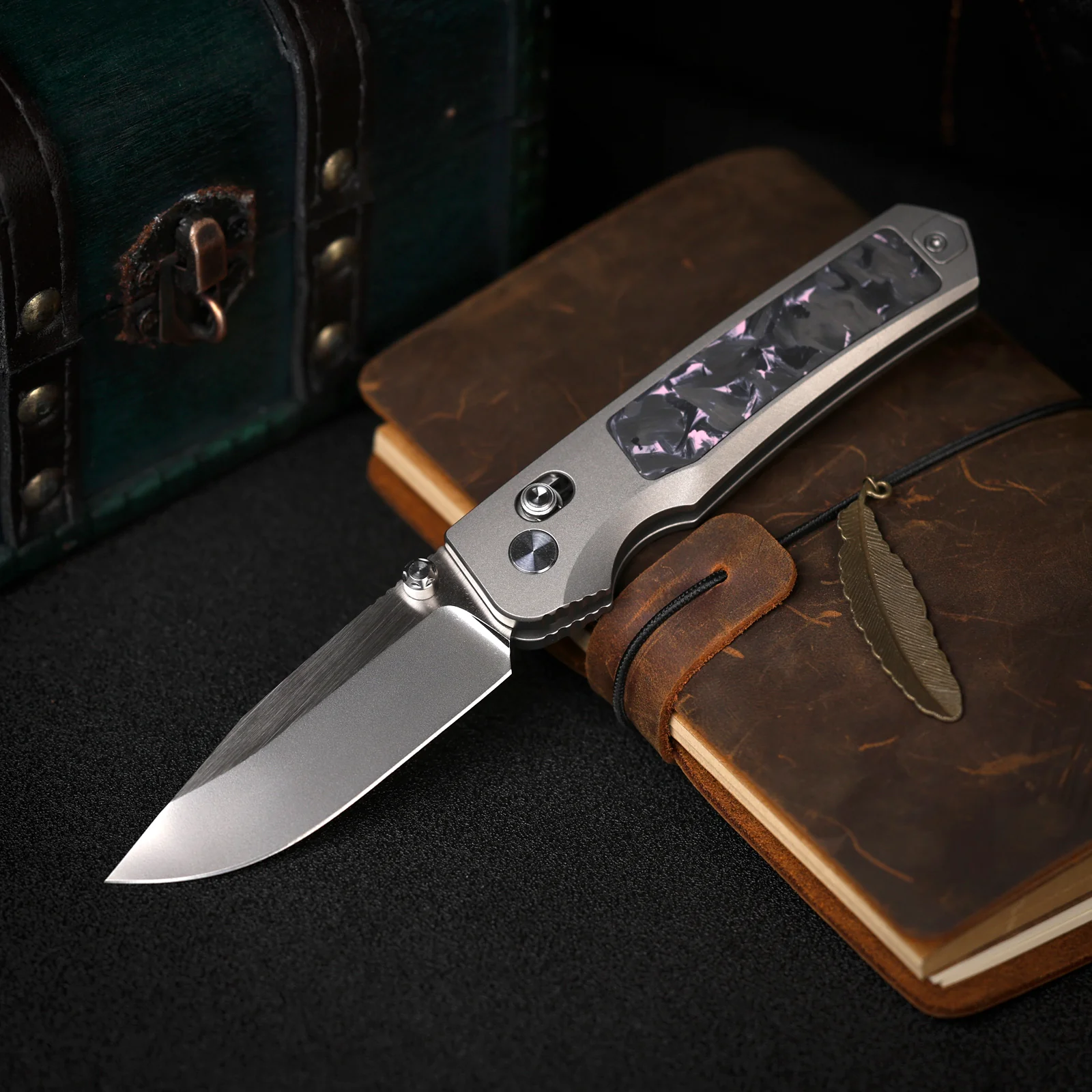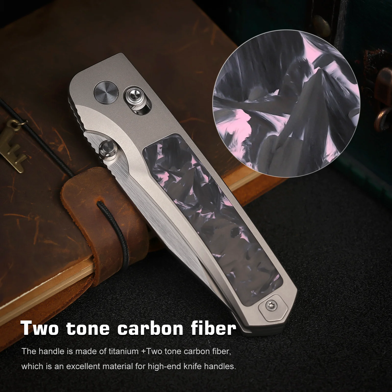 AURA-P — версия с титановой рукоятью и вставкой из черно-розового карбона. Это один из самых выразительных вариантов серии: розовый оттенок добавляет модели более необычный и декоративный характер, но общая подача остается сдержанной за счет серого титана и светлого клинка.