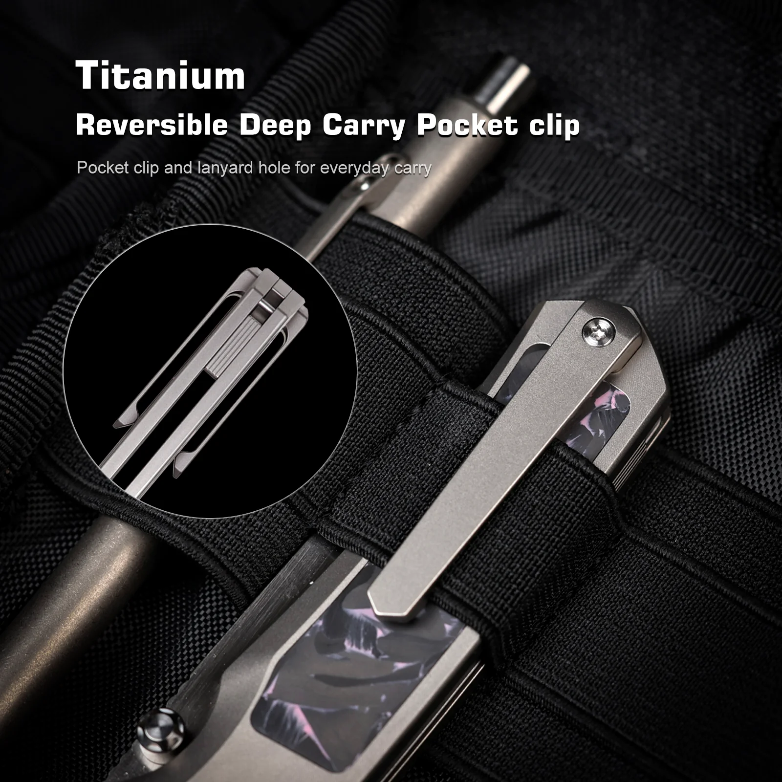 По конструкции Remette Aurora — это нож для тех, кому важны и удобство, и приятная механика. Здесь используется crossbar lock, то есть поперечный замок в духе axis-подобной схемы, а открывание осуществляется двусторонним шпеньком. Продавцы отдельно отмечают керамические подшипники в осевом узле, благодаря чему нож должен открываться мягко и легко одной рукой. Рукоять выполнена из титана, а карбоновая вставка добавляет модели более дорогой и выразительный вид, не перегружая ее внешне. Клипса рассчитана на ношение острием вверх и переставляется под правую и левую руку.