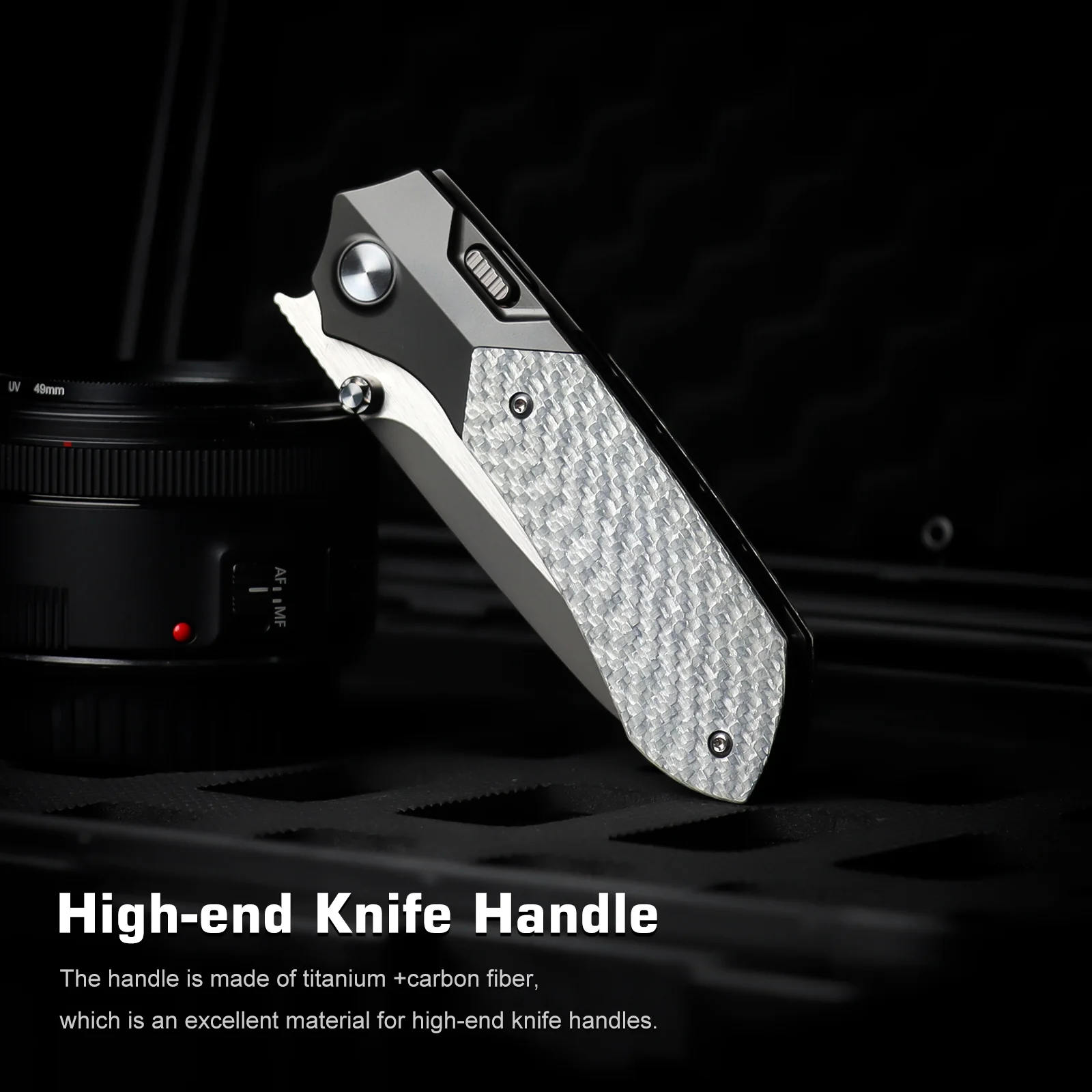 RTPT-D — версия с титановой рукоятью и вставками из карбона с медной фольгой. На фоне остальных исполнений это один из самых теплых и заметных вариантов серии: медные переливы делают нож более нарядным и коллекционным по настроению. Клинок у этой версии светлый, с рабоче-декоративной обработкой.