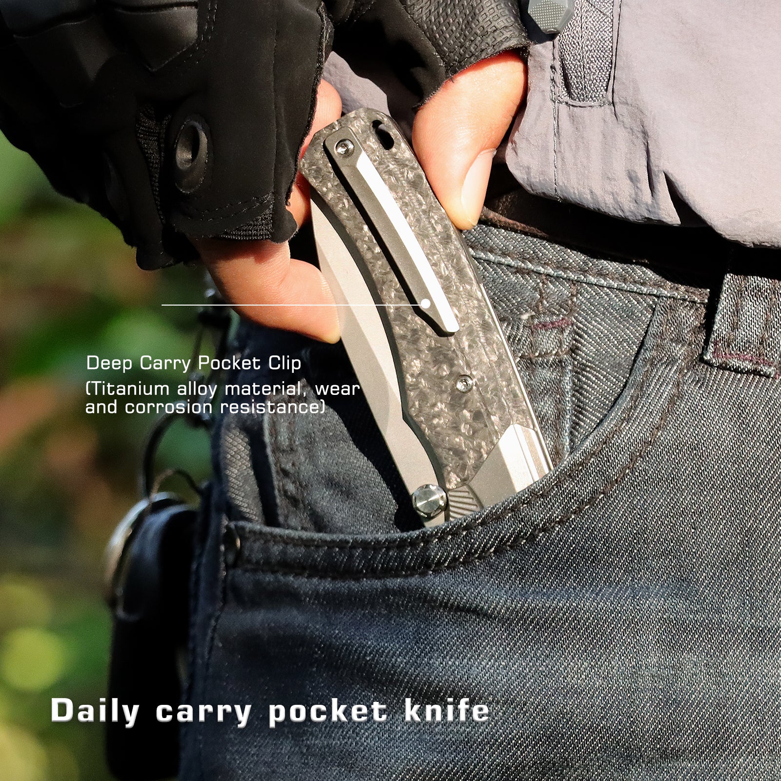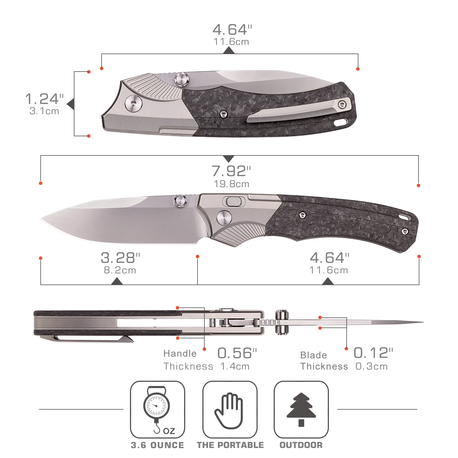 По конструкции это не просто декоративный титановый складень, а вполне прикладной EDC-нож. В серии WD107 используется кнопочный замок типа button lock, открывание осуществляется шпенеком, а сама рукоять имеет изогнутую форму, которая лучше ложится в ладонь и делает нож комфортнее в работе. Титан отвечает за прочность и жесткость конструкции, а карбон помогает облегчить рукоять и добавляет модели более дорогой, «верхней» по классу внешний вид.