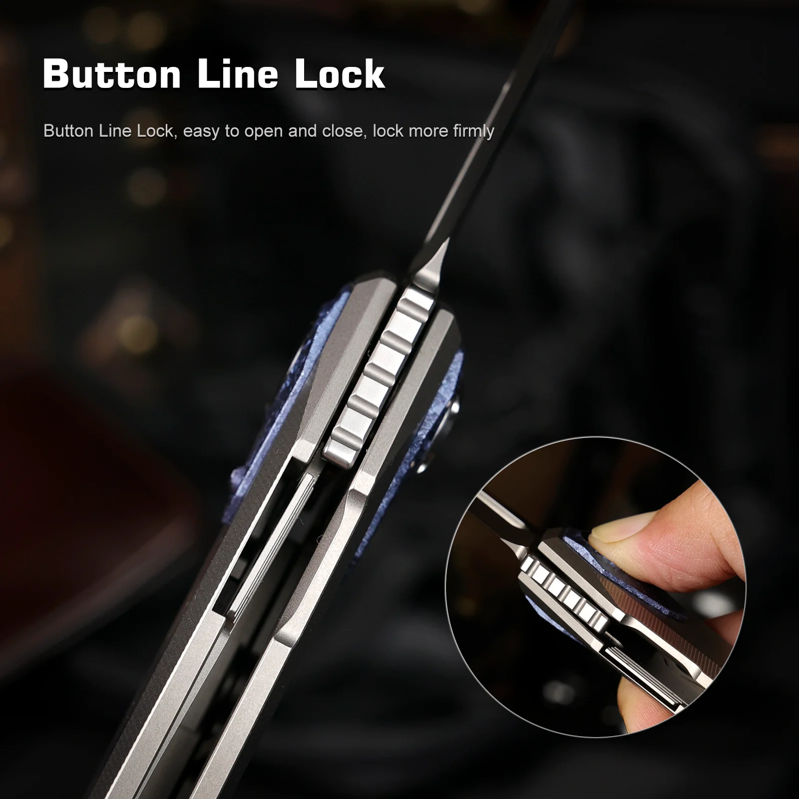 RTIP-D — версия с максимально строгой и контрастной подачей: здесь используется черное DLC-покрытие на клинке и черная титановая рукоять, а акцент в районе кнопки и осевого узла выполнен в сине-кристаллизованном стиле. Это один из самых «темных» и визуально собранных вариантов в серии.
