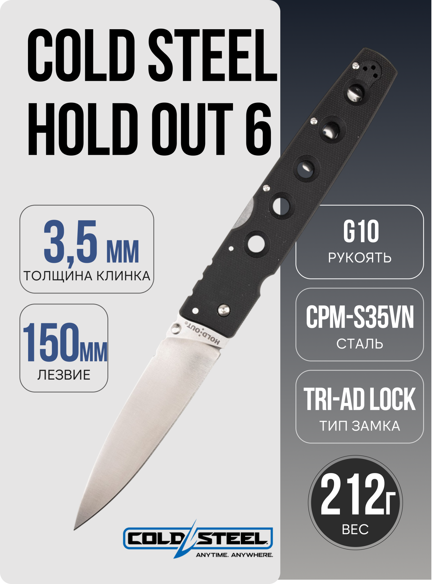 Нож Cold Steel Hold Out 6. Клинок изготовлен из премиальной, хорошо сохраняющей остроту Американской порошковой стали CPM S35VN, а рукоять из алюминия из G10 (в данном экземпляре черного цвета).