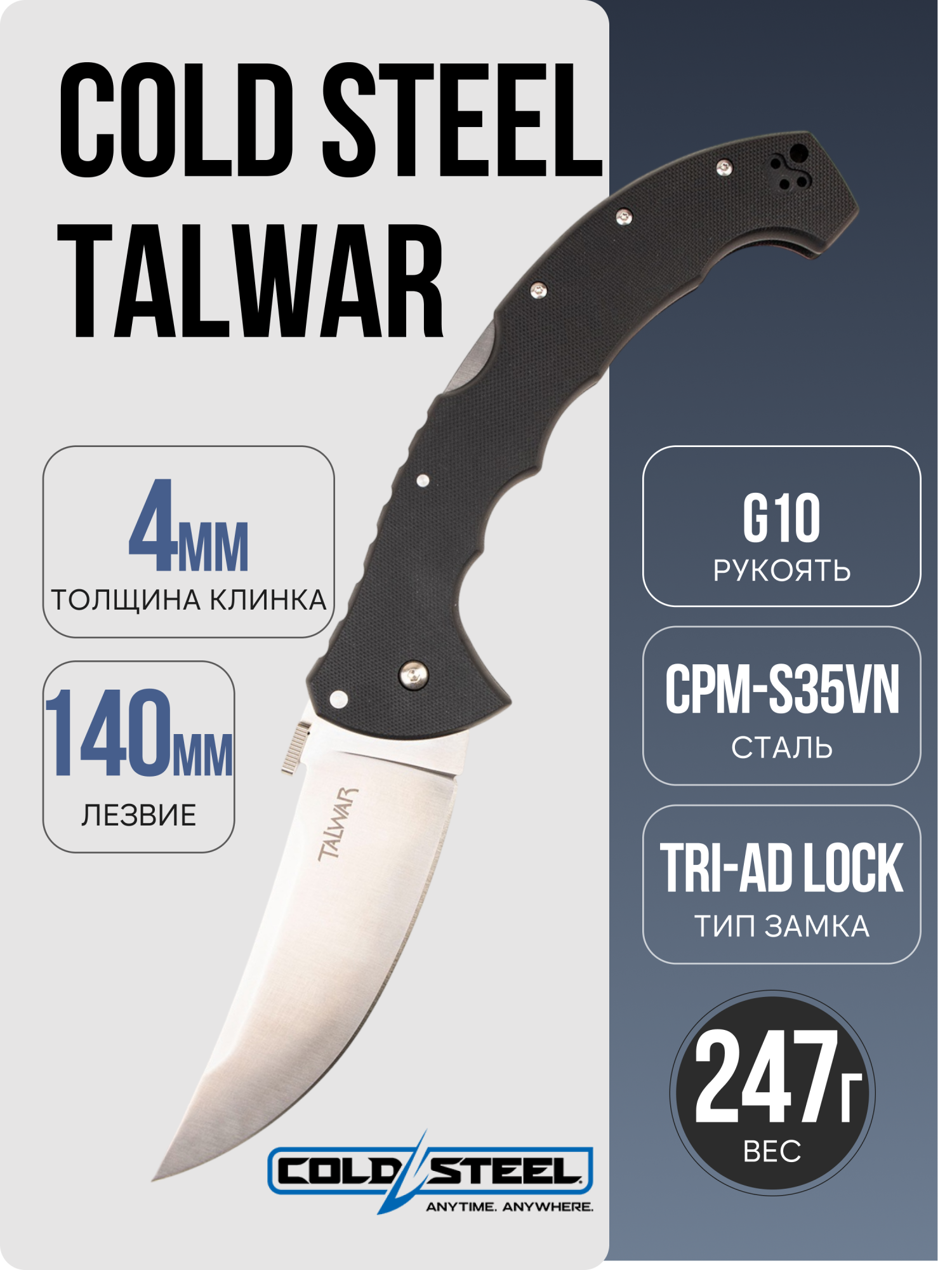 Нож Cold Steel Talwar - это мощный, с широким клинком нож. Клинок изготовлен из премиальной, хорошо сохраняющей остроту Американской порошковой стали CPM S35VN, закалённой до твёрдости 59-60 HRc, а рукоять из G10 (в данном экземпляре черного цвета).