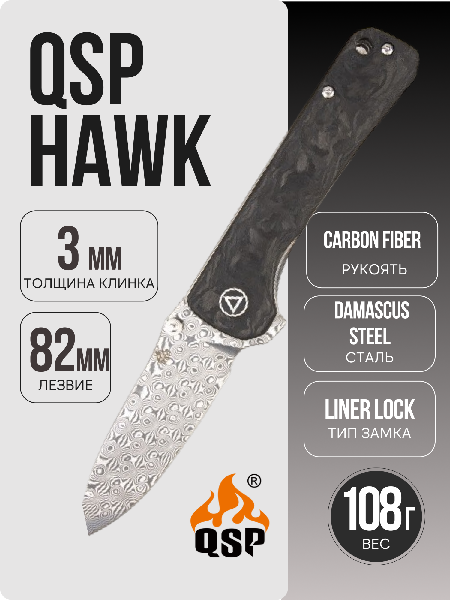 Нож QSP Hawk – это стильный и надёжный EDC нож. Клинок изготовлен из дамасской стали, а рукоять из углеродного волокна (Карбона). Благодаря керамической шарикоподшипниковой системе, клинок плавно открывается, а механизм замка Liner Lock надёжно фиксирует в раскрытом положении. Раскрыть клинок можно, как с помощью флиппера, так и шпенька (как с левой так и с правой стороны) для большого пальца.